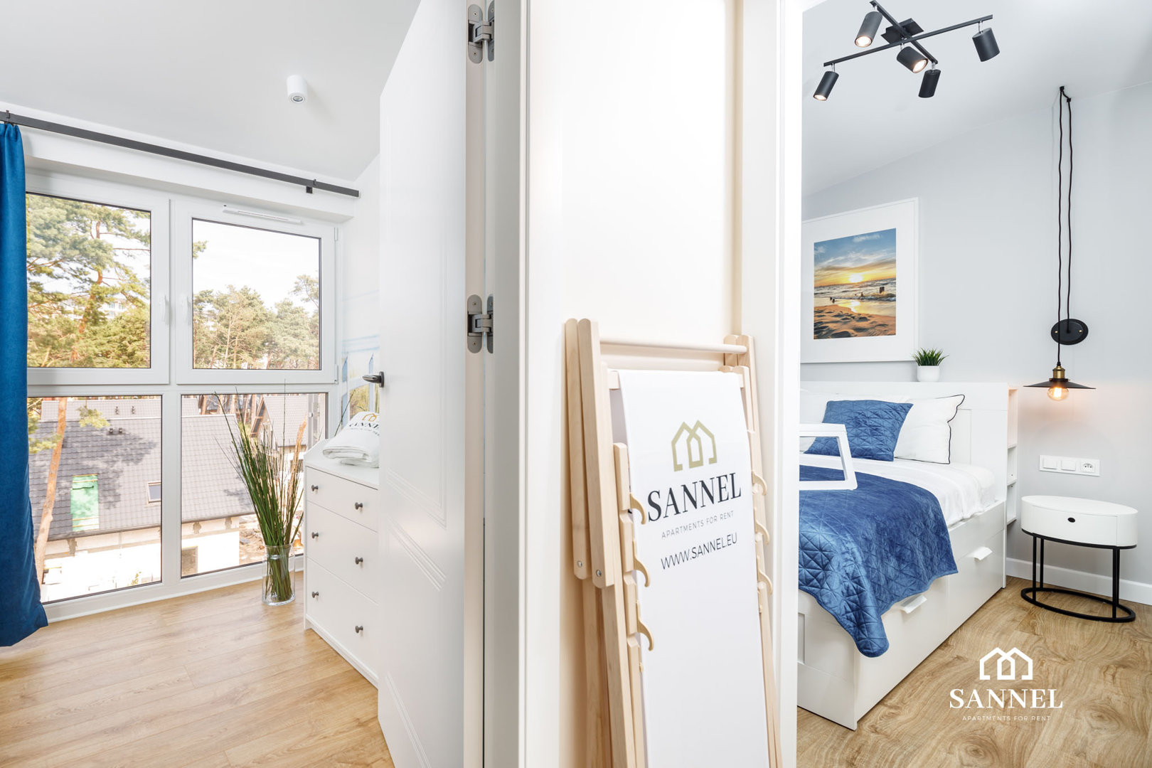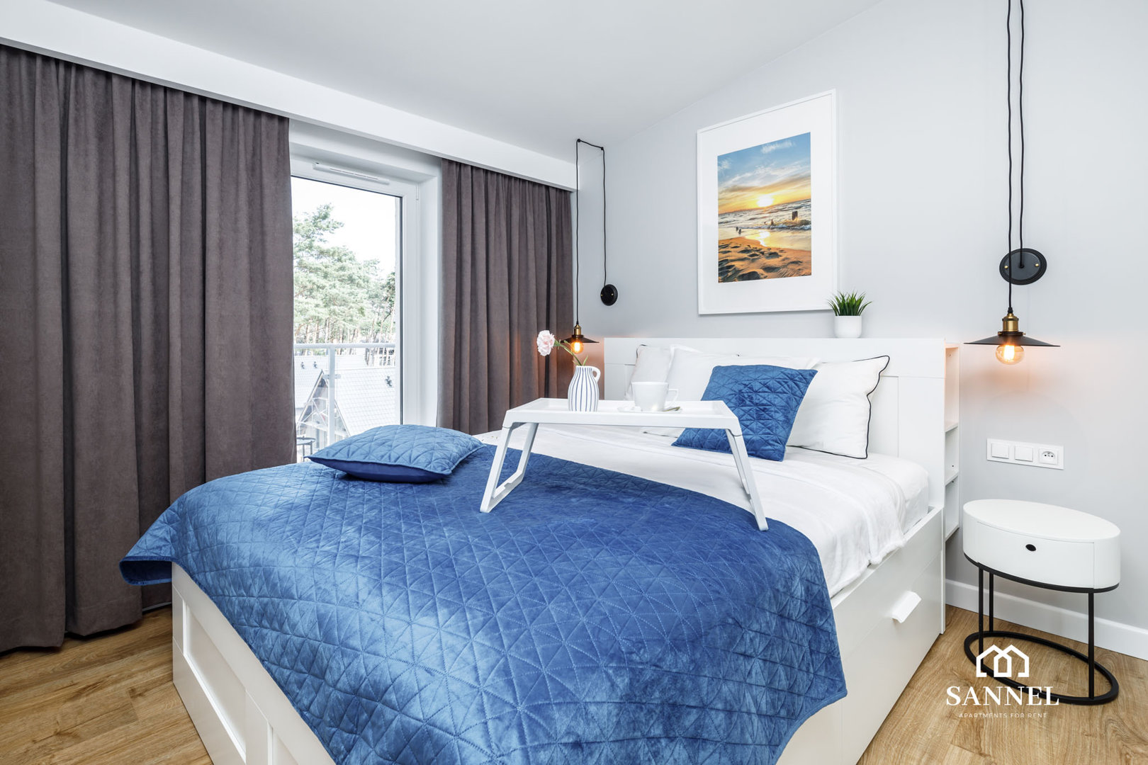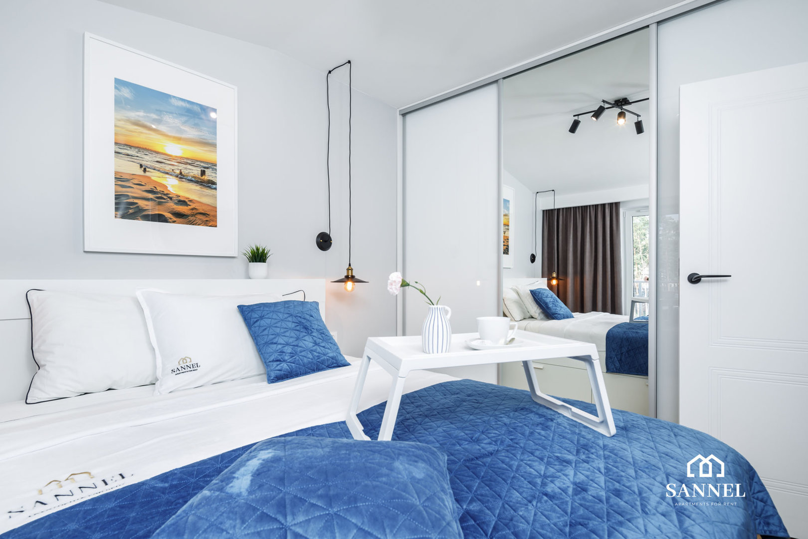 Główna sypialnia apartamentu Golden Dune składa się z dużego łóżka sypialnianego, szafek nocnych z dostępem do gniazdek,pakowanej szafy z lustrem. Z tego miejsca także można skorzystać z balkonu z kompletem wypoczynkowym. Druga sypialnia zaaranżowana została w łóżko piętrowe oraz dużą komodę do swobodnego przechowywania rzeczy osobistych.