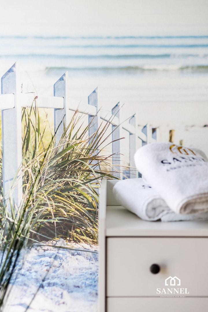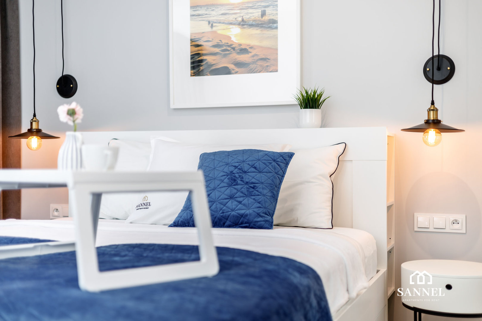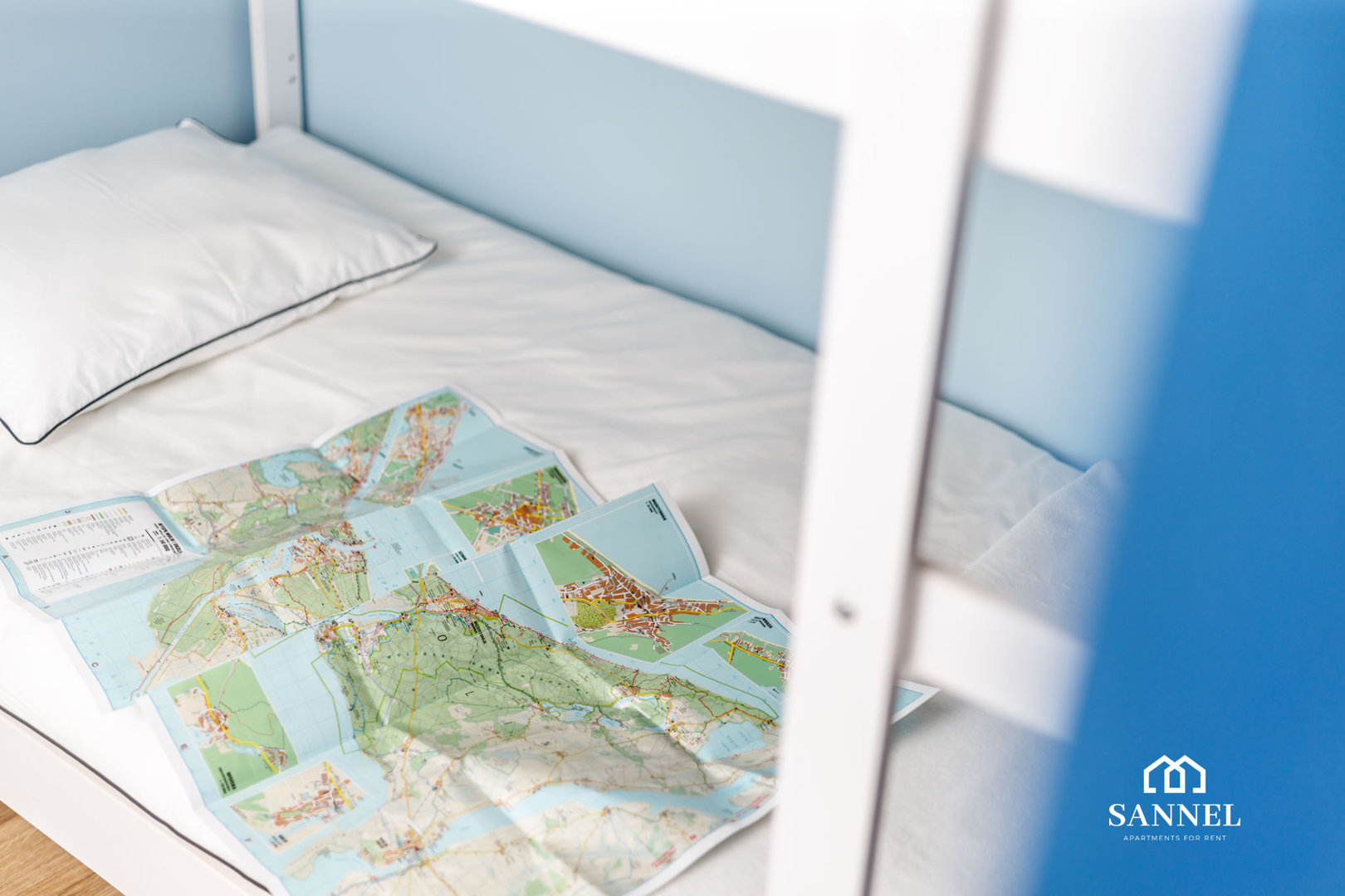 Główna sypialnia apartamentu Golden Dune składa się z dużego łóżka sypialnianego, szafek nocnych z dostępem do gniazdek,pakowanej szafy z lustrem. Z tego miejsca także można skorzystać z balkonu z kompletem wypoczynkowym. Druga sypialnia zaaranżowana została w łóżko piętrowe oraz dużą komodę do swobodnego przechowywania rzeczy osobistych.