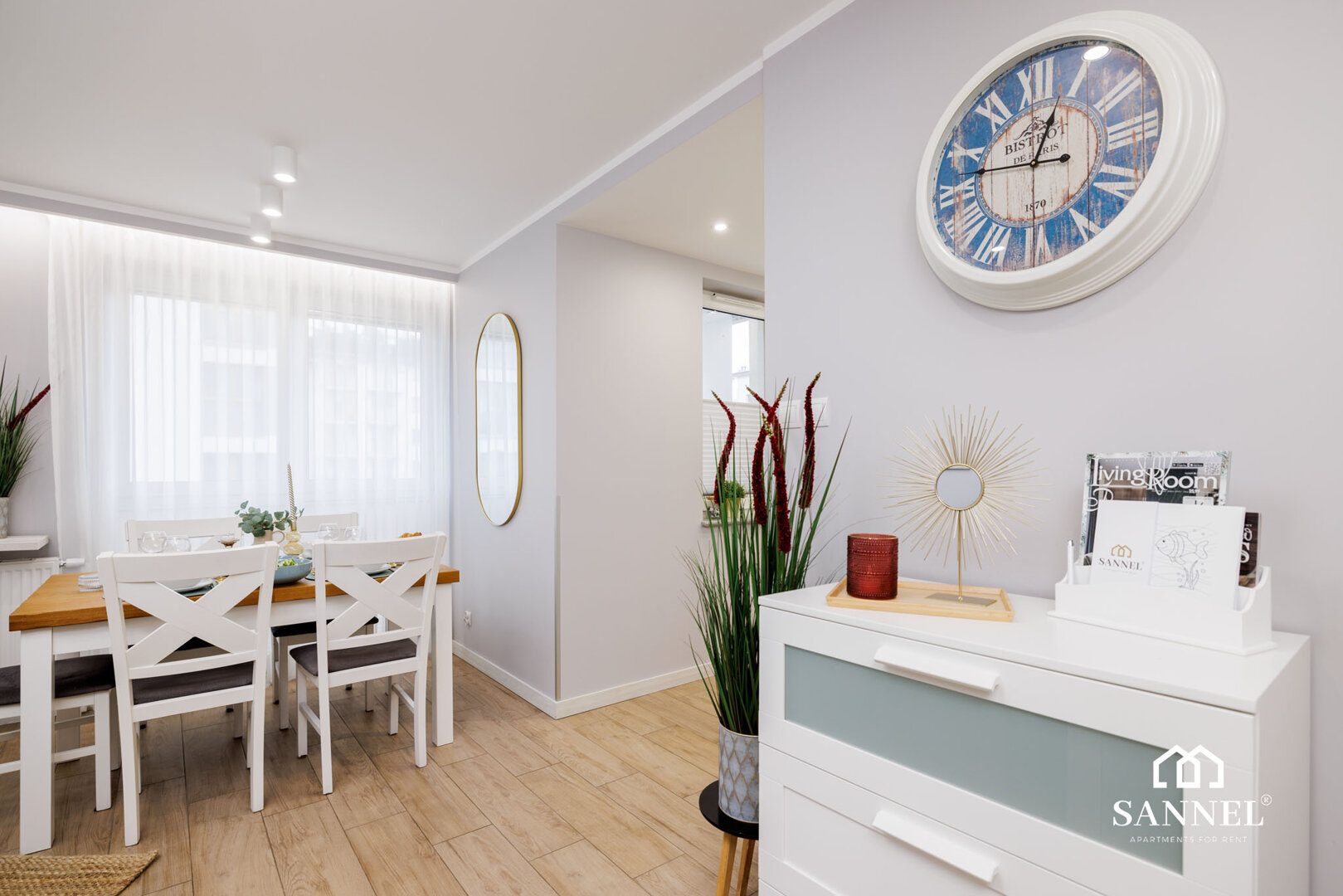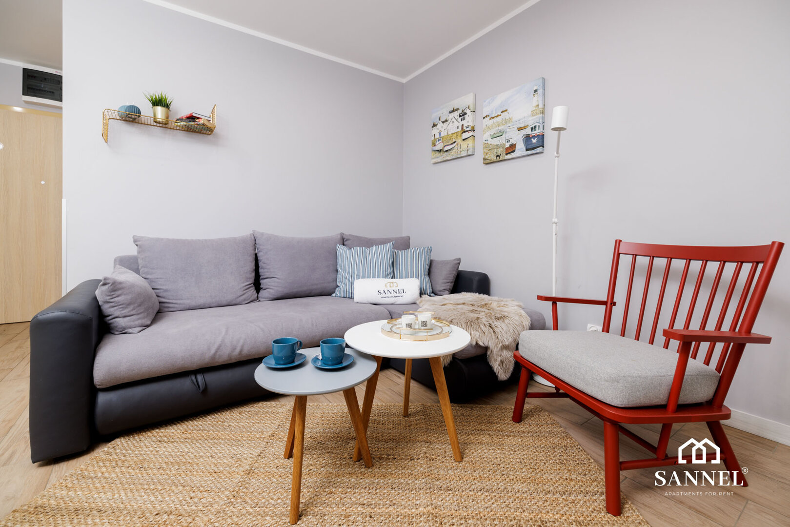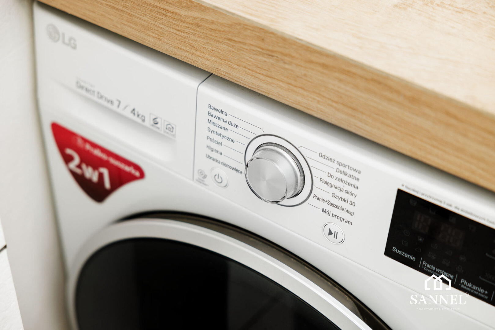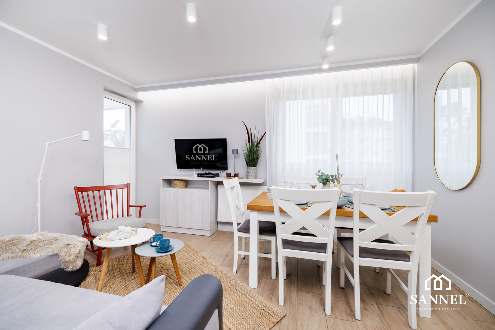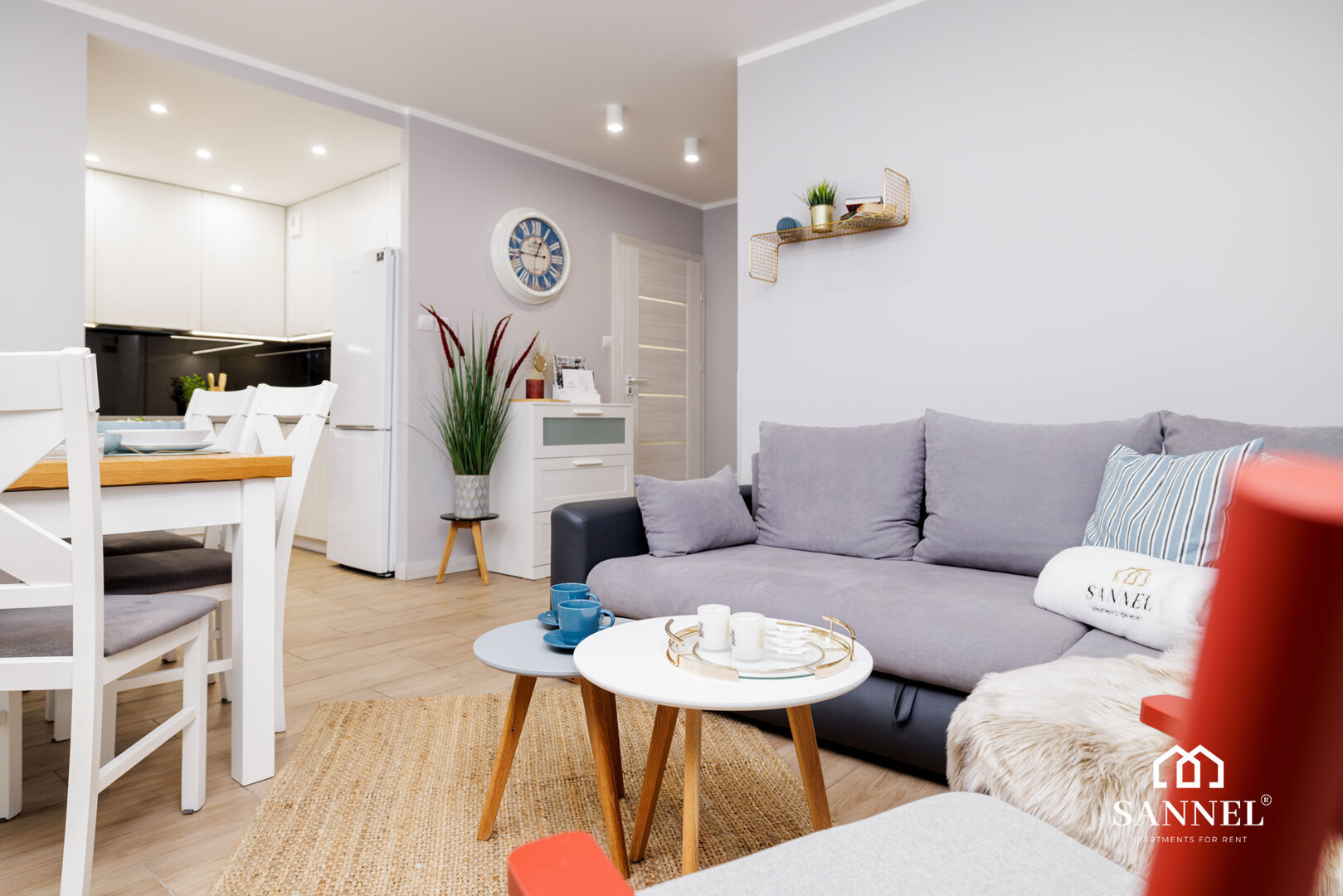 LightHouse to mimo parametrów,przestronny a zarazem bardzo komfortowy apartament przystosowany do czterech osób lub dwóch dorosłych gości i trójki małych dzieci.Klimatyczny apartament składa się z salonu z aneksem kuchennym z wydzielonym miejscem do spożywania posiłków, sypialni,łazienki oraz dużego,zadaszoengo balkonu. Salon wyposażony został w sofę z funkcją spania, wygodny fotel, stolik kawowy a także TV z płaskim ekranem z dostępem do kanałów w różnych językach, internetu oraz platform streamingowych. Z tego miejsca udać się można na balkon, na którym znajduje się komplet mebli. Aneks kuchenny apartamentu LightHouse wyposażony został we wszystkie potrzebne sprzęty AGD takie jak toster, czajnik elektryczny, ekspres do kawy, płytę indukcyjną a także akcesoria, potrzebne do przygotowania posiłków.Przestronna i bardzo przytulna sypialnia posiada duże łóżko małżeńskie (160x200),szafkę nocną oraz bardzo pojemną szafę.Łazienka wyposażona została w przestronny prysznic, umywalkę z blatem i szafką, podświetlane lustro,toaletę a także pralkosuszarkę.W korytarzu apartamentu znajduje się także oddzielna szafa z dużą ilością miejsca do przechowywania.