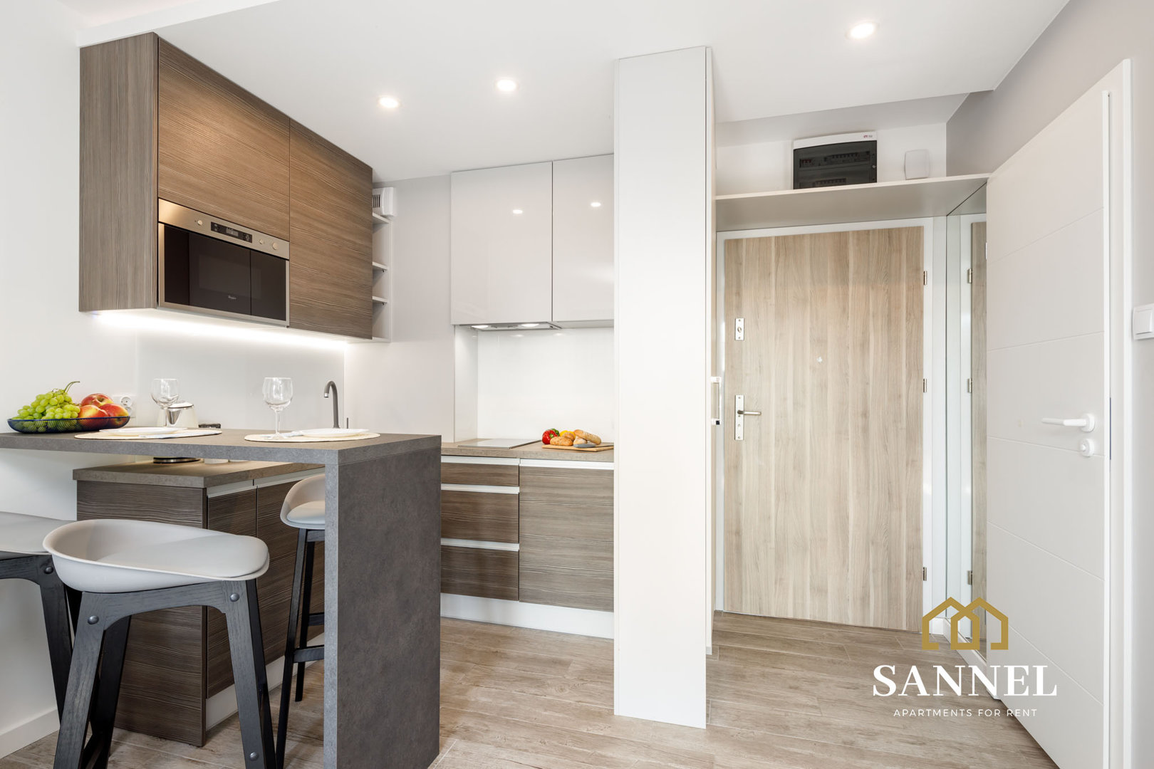 Nautical składa się z salonu wraz z aneksem kuchennym, sypialni oraz łazienki. Salon wyposażony został w rozkładaną sofę, podświetlaną szafkę telewizyjną, płaski TV z dostępem do kanałów kablowych oraz rozkładany stolik kawowy. Z tego miejsca udać się można na balkon wyposażony w meble balkonowe. Aneks kuchenny połączony z salonem, dzięki ławie z hokerami, daje spójność dwóm pomieszczeniom a jednocześnie stanowi miejsce do spożywania posiłków. Aneks kuchenny wyposażony został w takie urządzenia jak czajnik elektryczny, ekspres do kawy, piekarnik z funkcją mikrofalówki, płytę indukcyjną, zmywarkę czy toster. W nim także znajdują się wszystkie potrzebne akcesoria do przygotowania posiłków. Sypialnia posiada duże podwójne łóżko ( kontynentalne ), przestronną szafę, lustro. Wedle życzenia miejsce do spania można rozdzielić na dwa oddzielne pojedyncze łóżka lub pozostawić jako jedno sypialniane. Łazienka apartamentu Nautical składa się z dużej, bezprogowej kabiny prysznicowej, umywalki z blatem oraz toalety. Na korytarzu apartamentu znajduje się szafa do przechowywania odzieży wierzchniej.