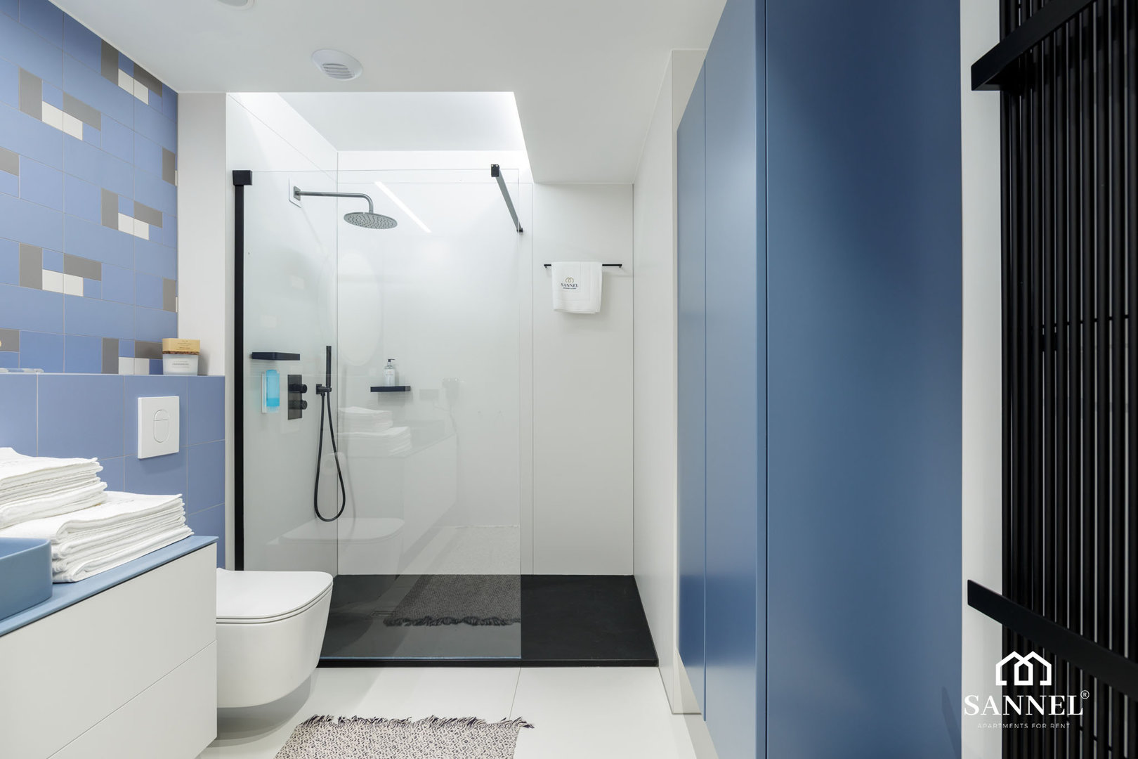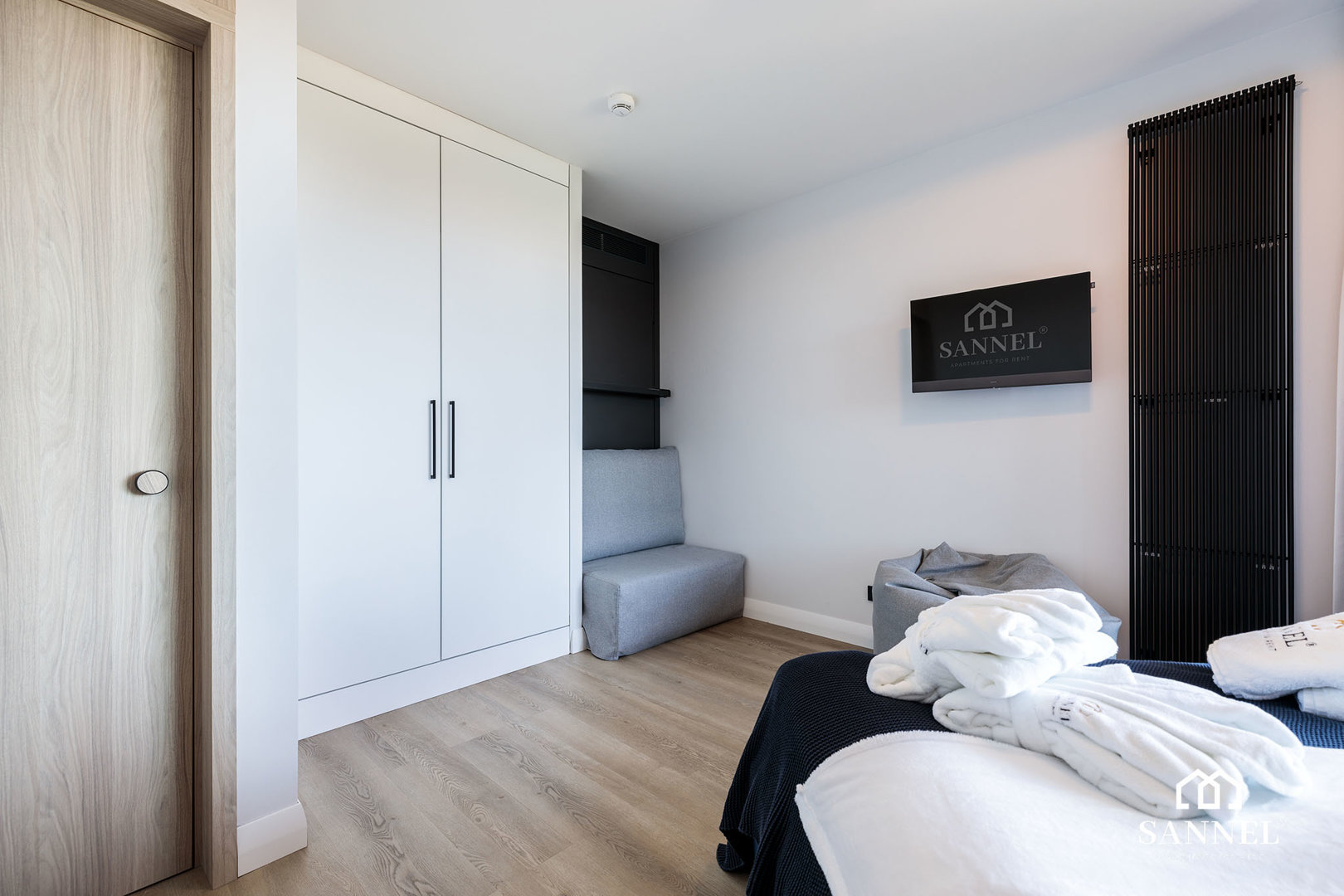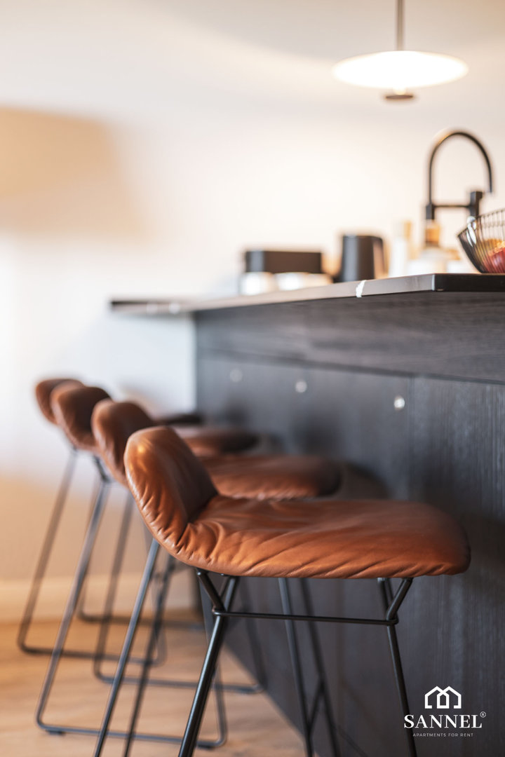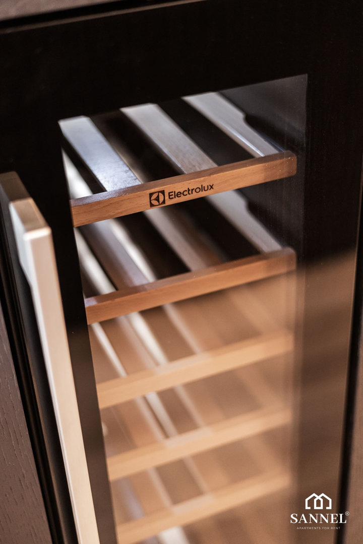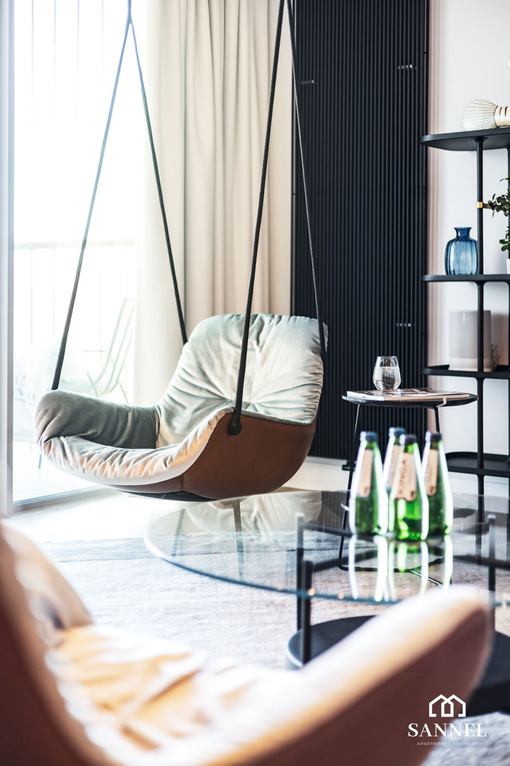 Ten wyjątkowy apartament został wyposażony w najwyższej jakości sprzęty oraz umeblowanie. Apartament Exclusive składa się z salonu z aneksem kuchennym z wydzielonym miejscem do spożywania posiłków w postaci dużej wyspy kuchennej z hokerami, sypialni, łazienki oraz dwóch balkonów z widokiem na morze. Salon wyposażony został w sofę z funkcją spania, stoliki kawowe, huśtawkę a także TV z płaskim ekranem z dostępem do kanałów w różnych językach, internetu oraz platform streamingowych. Z tego miejsca udać się można na jeden z dwóch balkonów, na którym znajduje się komplet mebli wypoczynkowych. Aneks kuchenny apartamentu Exclusive wyposażony został we wszystkie potrzebne sprzęty AGD takie jak toster, dotykowy czajnik elektryczny, ekspres do kawy, płytę indukcyjną a także lodówkę do chłodzenia napojów oraz akcesoria, potrzebne do przygotowania posiłków. Przestronna sypialnia posiada duże łóżko małżeńskie wraz z szafkami nocnymi z lampkami do czytania,pojemną szafę do przechowywania ubrań a także TV z dostępem do kanałów w różnych językach, internetu oraz platform streamingowych. Z sypialni apartamentu wyjść można na drugi balkon gdzie znajduje się także komplet mebli wypoczynkowych. W łazience znajduje się przestronny prysznic z odpływem liniowym, umywalka z blatem i szafką, podświetlane lustro,szafka z półkami, pralka oraz toaleta.