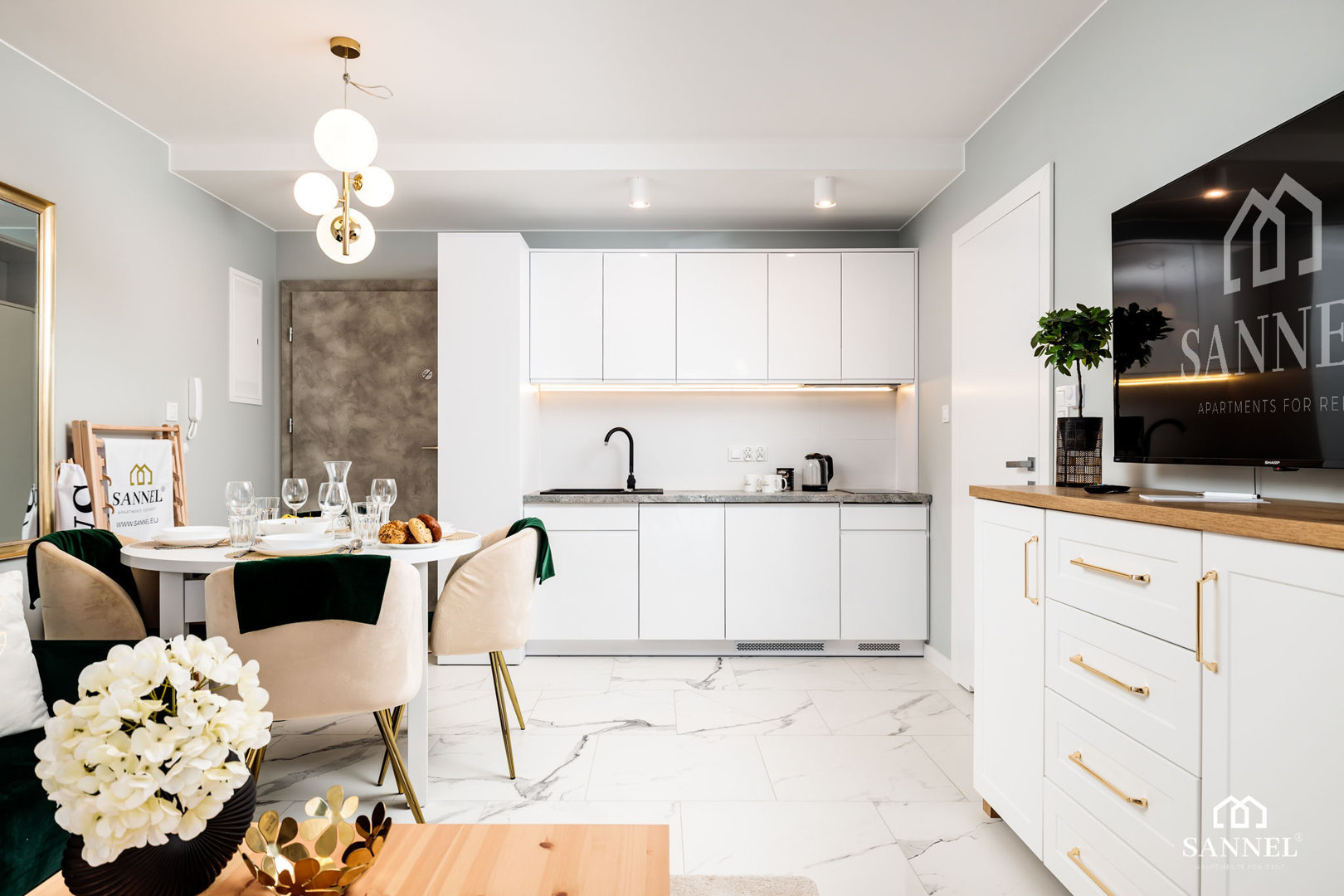 Gold Sea usytuowany jest na trzecim piętrze trzypiętrowego budynku z windą od strony północnej i zachodniej. Składa się z salonu z aneksem kuchennym z wydzielonym miejscem do spożywania posiłków, sypialni, łazienki oraz dużego narożnego tarasu. Salon wyposażony został w sofę z funkcją spania, stolik kawowy, komodę do przechowywania ubrań, TV z płaskim ekranem z dostępem do kanałów kablowych, internetu oraz platform streamingowych. W tym pomieszczeniu znajduje się stół z krzesłami do spożywania posiłków. Z salonu można wyjść na przestronny taras gdzie znajduje się komplet mebli tarasowych. Aneks kuchenny apartamentu Gold Sea wyposażony został we wszystkie potrzebne sprzęty AGD takie jak toster, czajnik elektryczny, ekspres do kawy, dwupalnikową płytę indukcyjną oraz wszelkie akcesoria, potrzebne do przygotowania posiłków. Przestronna sypialnia posiada duże łóżko małżeńskie z oświetleniem do czytania. Z tego miejsca także można udać się na taras. W łazience znajduje się kabina prysznicowa, umywalka z szafką,toaleta a także pralka.