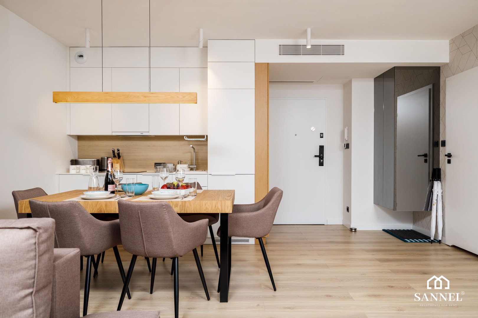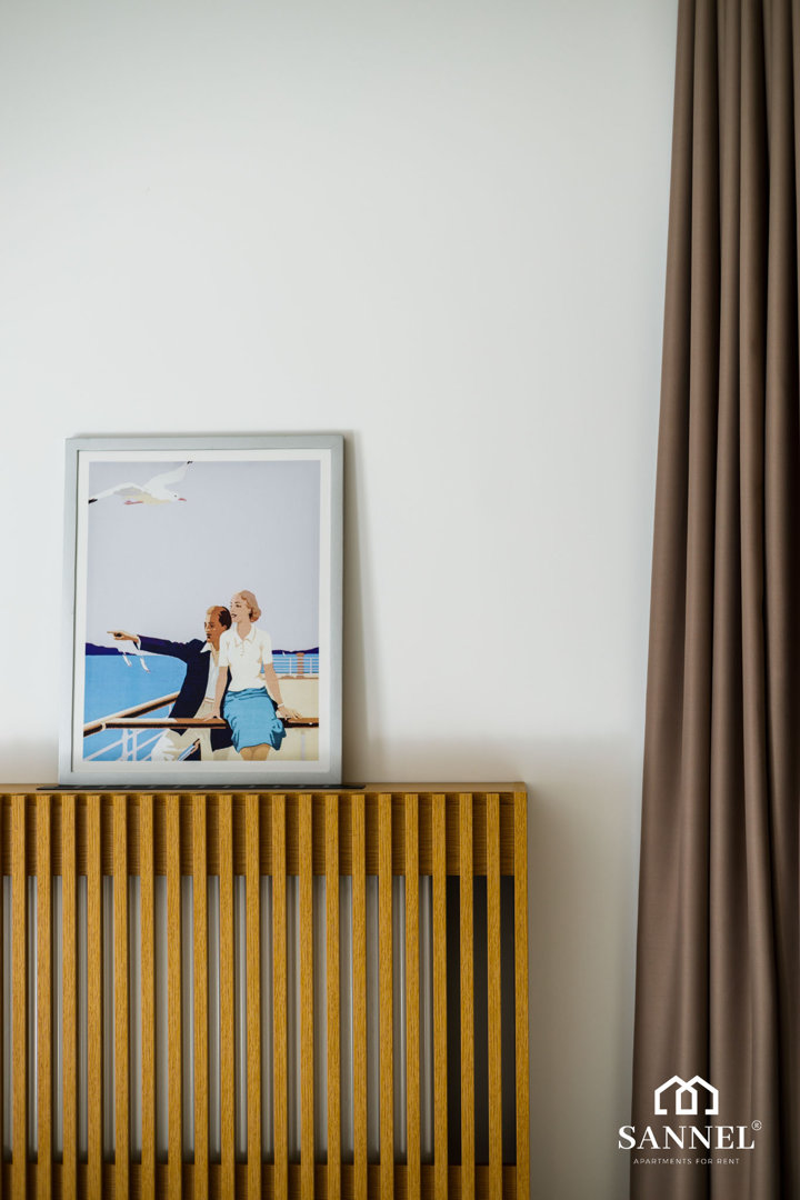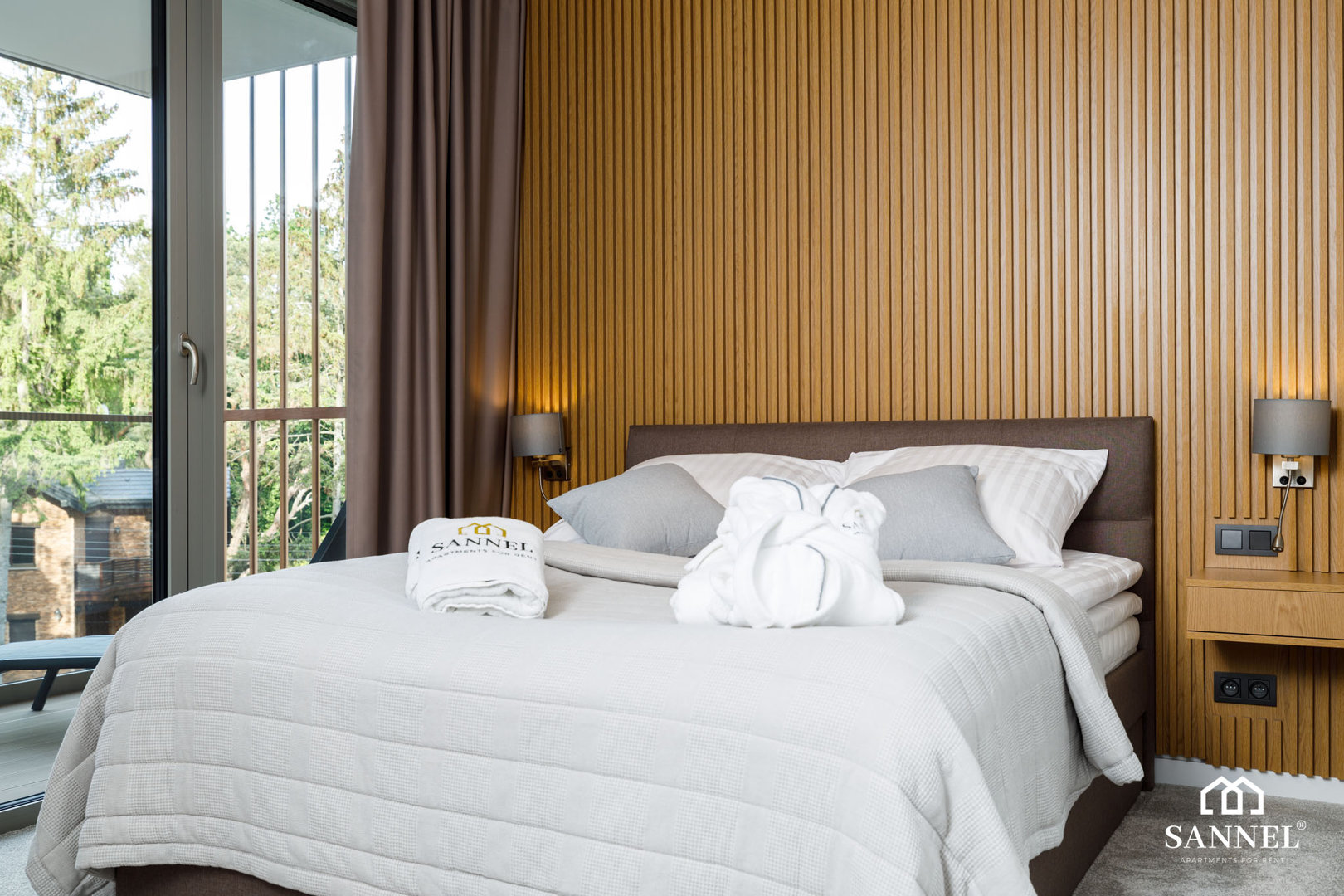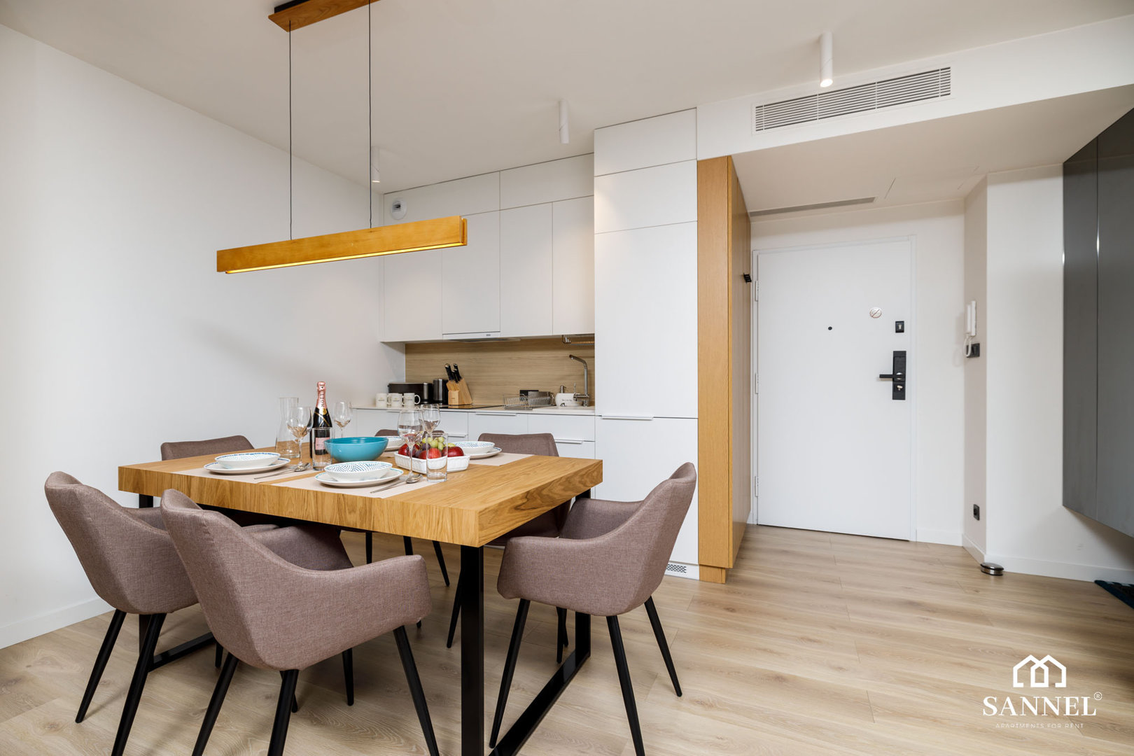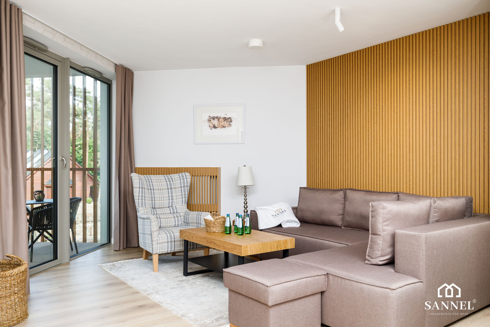 Składa się on z salonu z aneksem kuchennym z wydzielonym miejscem do spożywania posiłków, sypialni, łazienki oraz dwóch balkonów. Salon wyposażony został w rozkładany narożnik z funkcją spania, stolik kawowy, zabudowaną szafkę na przybory kuchenne, TV LED z płaskim ekranem z dostępem do kanałów w różnych językach, z dostępem do internetu oraz platform streamingowych. W tym pomieszczeniu znajduje się także duży stół z krzesłami do spożywania posiłków. Z salonu wyjść można na jeden z dwóch balkonów, na którym umieszczony został komplet mebli wypoczynkowych. Aneks kuchenny wyposażony został we wszystkie potrzebne akcesoria i sprzęty AGD takie jak toster, czajnik elektryczny, ekspres do kawy, płyta indukcyjna dwupalnikowa, potrzebne do przygotowania posiłków. W aneksie umieszczona została także pralka. Przestronna sypialnia posiada duże łóżko małżeńskie wraz z szafkami nocnymi z oświetleniem i lampkami do czytania, pojemną szafę do przechowywania ubrań i sofę. W łazience znajduje się prysznic z odpływem liniowym, umywalka z blatem i szafką, wiszące szafki z półkami oraz toaleta. Tuż za drzwiami wejściowymi mieści się szafa na odzież wierzchnią a także szafki gdzie znajdują się akcesoria gospodarstwa domowego.