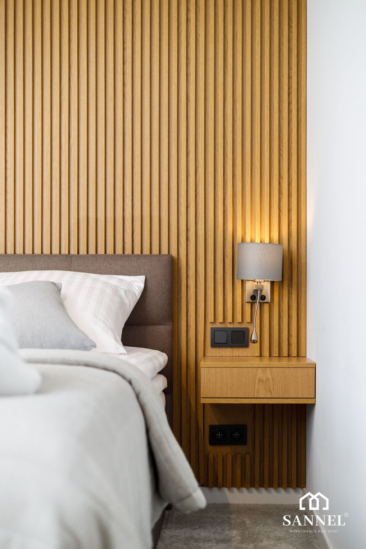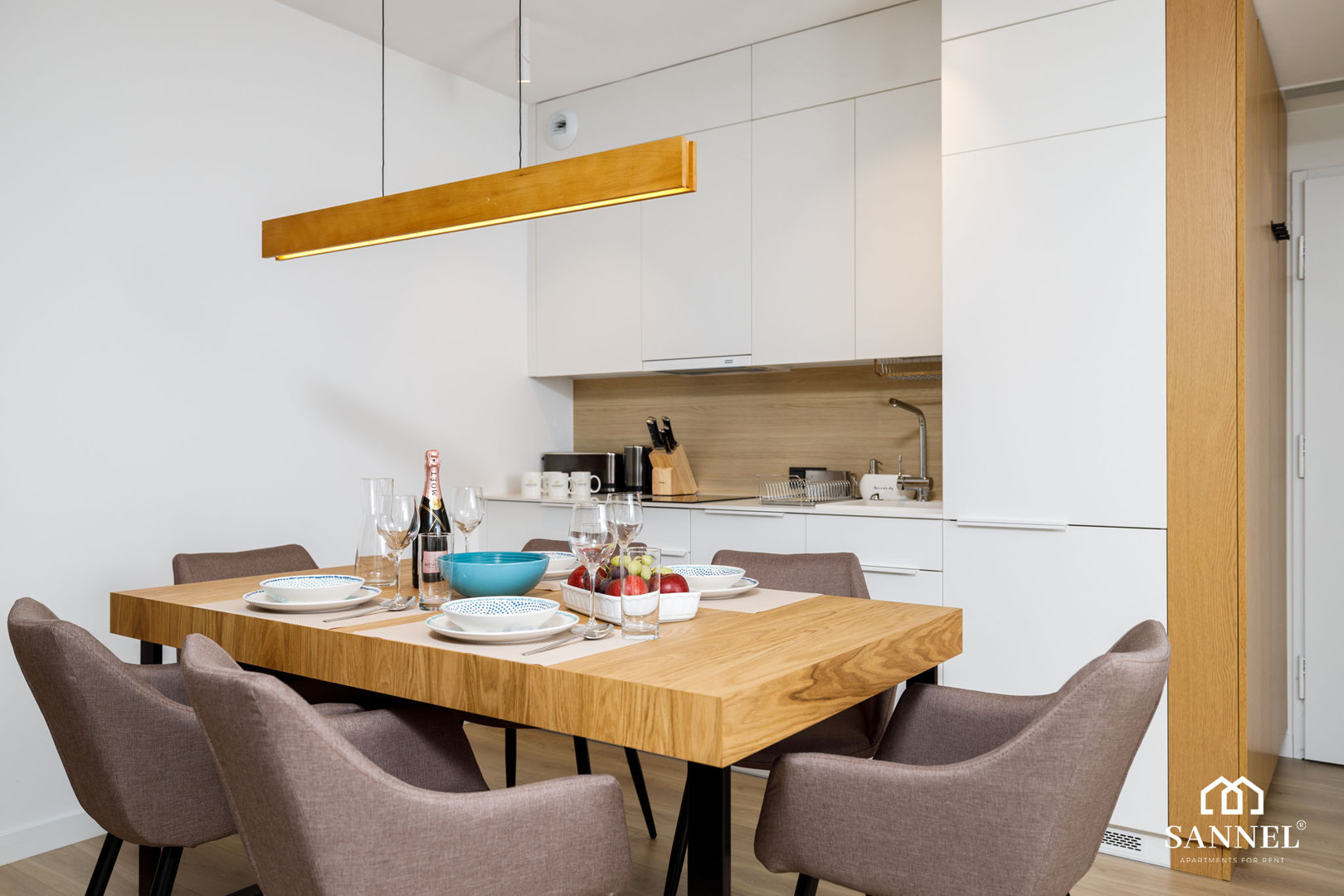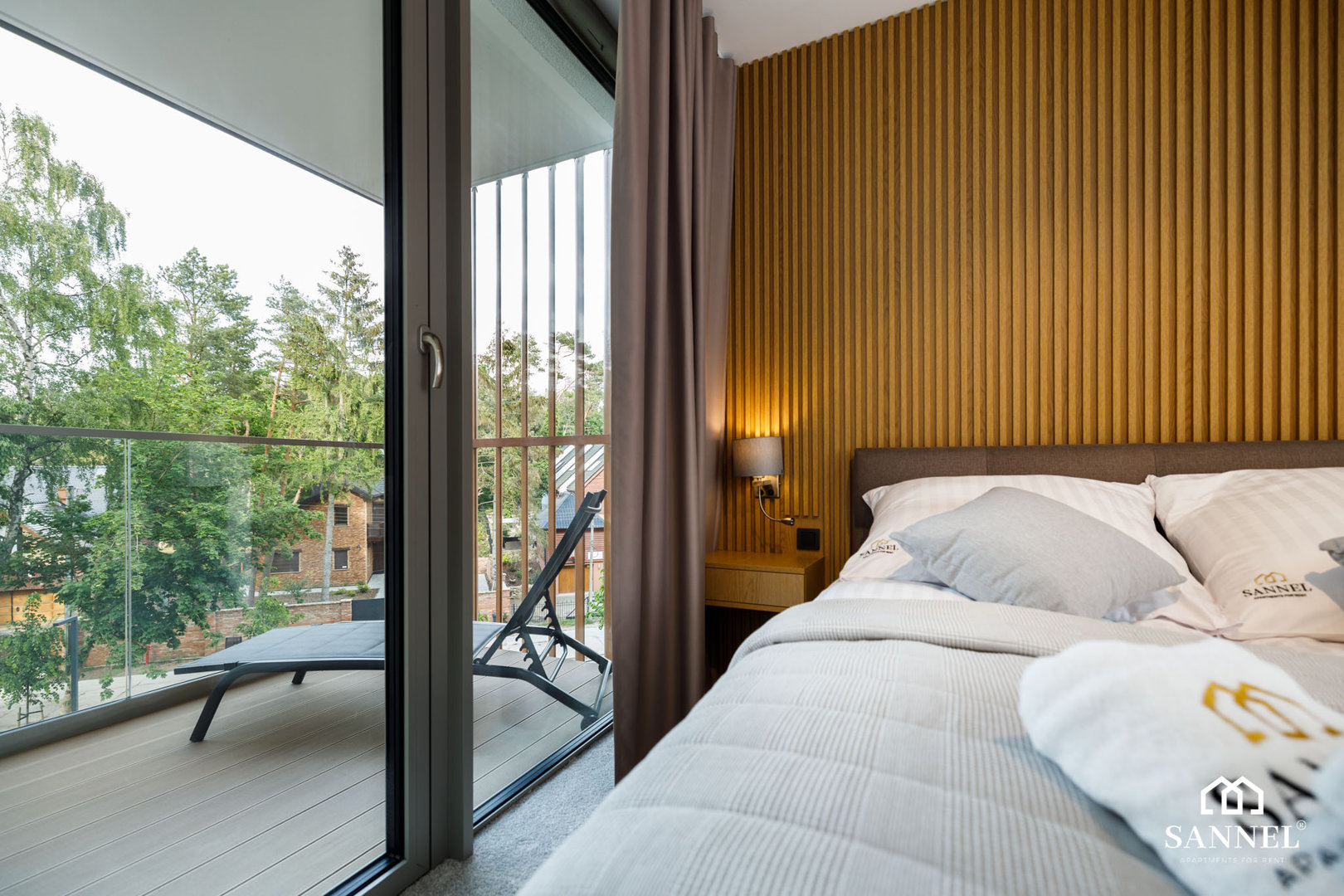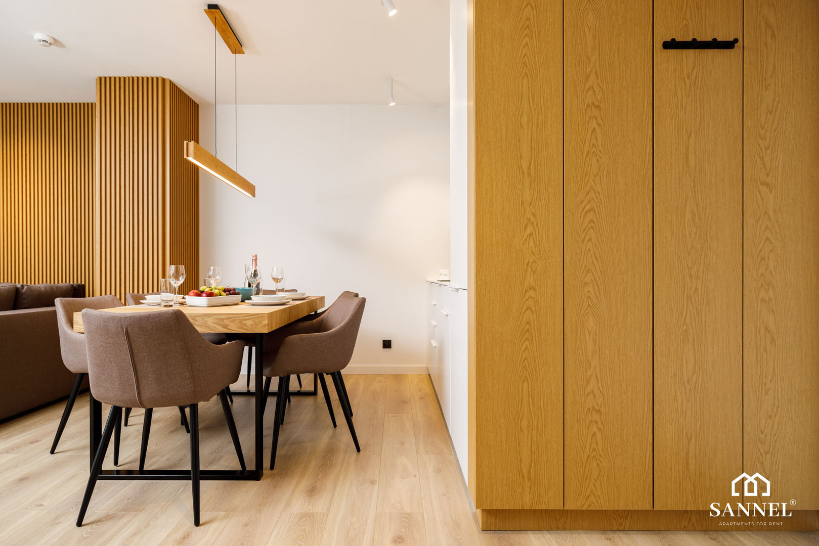 Składa się on z salonu z aneksem kuchennym z wydzielonym miejscem do spożywania posiłków, sypialni, łazienki oraz dwóch balkonów. Salon wyposażony został w rozkładany narożnik z funkcją spania, stolik kawowy, zabudowaną szafkę na przybory kuchenne, TV LED z płaskim ekranem z dostępem do kanałów w różnych językach, z dostępem do internetu oraz platform streamingowych. W tym pomieszczeniu znajduje się także duży stół z krzesłami do spożywania posiłków. Z salonu wyjść można na jeden z dwóch balkonów, na którym umieszczony został komplet mebli wypoczynkowych. Aneks kuchenny wyposażony został we wszystkie potrzebne akcesoria i sprzęty AGD takie jak toster, czajnik elektryczny, ekspres do kawy, płyta indukcyjna dwupalnikowa, potrzebne do przygotowania posiłków. W aneksie umieszczona została także pralka. Przestronna sypialnia posiada duże łóżko małżeńskie wraz z szafkami nocnymi z oświetleniem i lampkami do czytania, pojemną szafę do przechowywania ubrań i sofę. W łazience znajduje się prysznic z odpływem liniowym, umywalka z blatem i szafką, wiszące szafki z półkami oraz toaleta. Tuż za drzwiami wejściowymi mieści się szafa na odzież wierzchnią a także szafki gdzie znajdują się akcesoria gospodarstwa domowego.