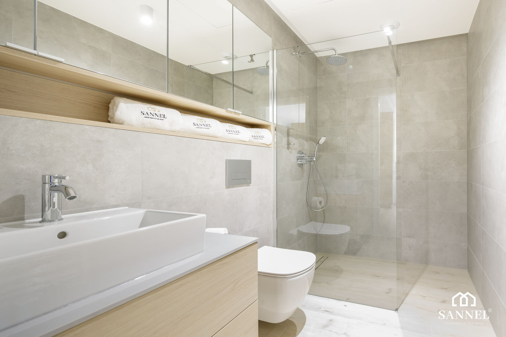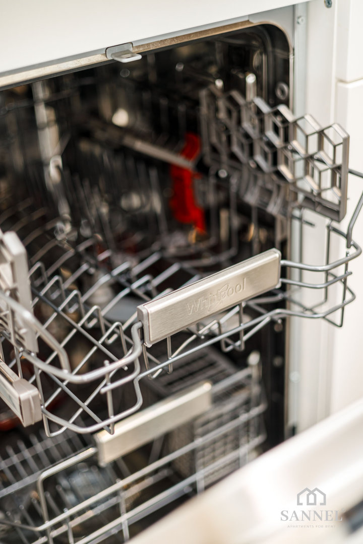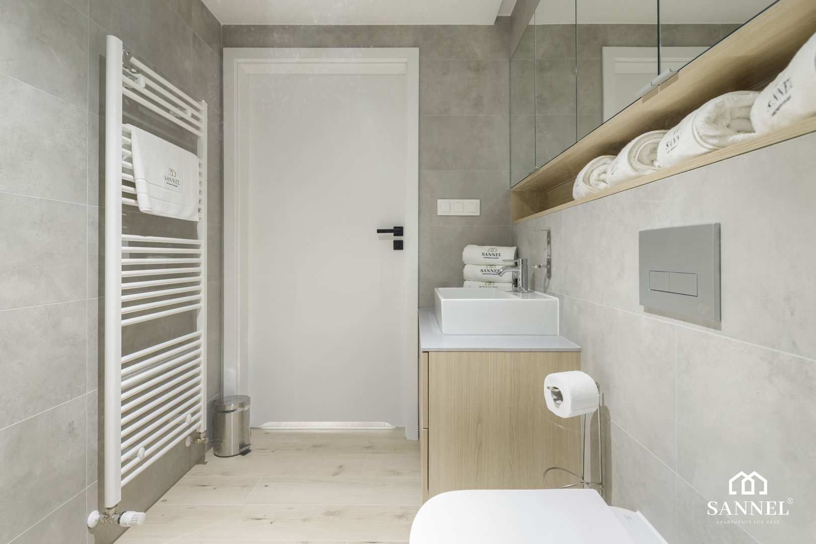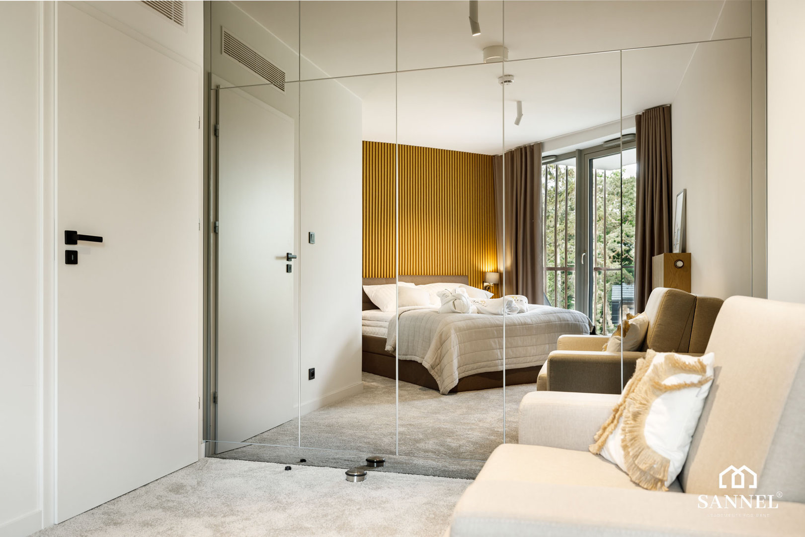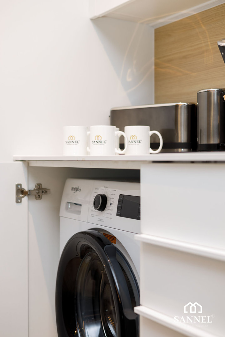 Składa się on z salonu z aneksem kuchennym z wydzielonym miejscem do spożywania posiłków, sypialni, łazienki oraz dwóch balkonów. Salon wyposażony został w rozkładany narożnik z funkcją spania, stolik kawowy, zabudowaną szafkę na przybory kuchenne, TV LED z płaskim ekranem z dostępem do kanałów w różnych językach, z dostępem do internetu oraz platform streamingowych. W tym pomieszczeniu znajduje się także duży stół z krzesłami do spożywania posiłków. Z salonu wyjść można na jeden z dwóch balkonów, na którym umieszczony został komplet mebli wypoczynkowych. Aneks kuchenny wyposażony został we wszystkie potrzebne akcesoria i sprzęty AGD takie jak toster, czajnik elektryczny, ekspres do kawy, płyta indukcyjna dwupalnikowa, potrzebne do przygotowania posiłków. W aneksie umieszczona została także pralka. Przestronna sypialnia posiada duże łóżko małżeńskie wraz z szafkami nocnymi z oświetleniem i lampkami do czytania, pojemną szafę do przechowywania ubrań i sofę. W łazience znajduje się prysznic z odpływem liniowym, umywalka z blatem i szafką, wiszące szafki z półkami oraz toaleta. Tuż za drzwiami wejściowymi mieści się szafa na odzież wierzchnią a także szafki gdzie znajdują się akcesoria gospodarstwa domowego.