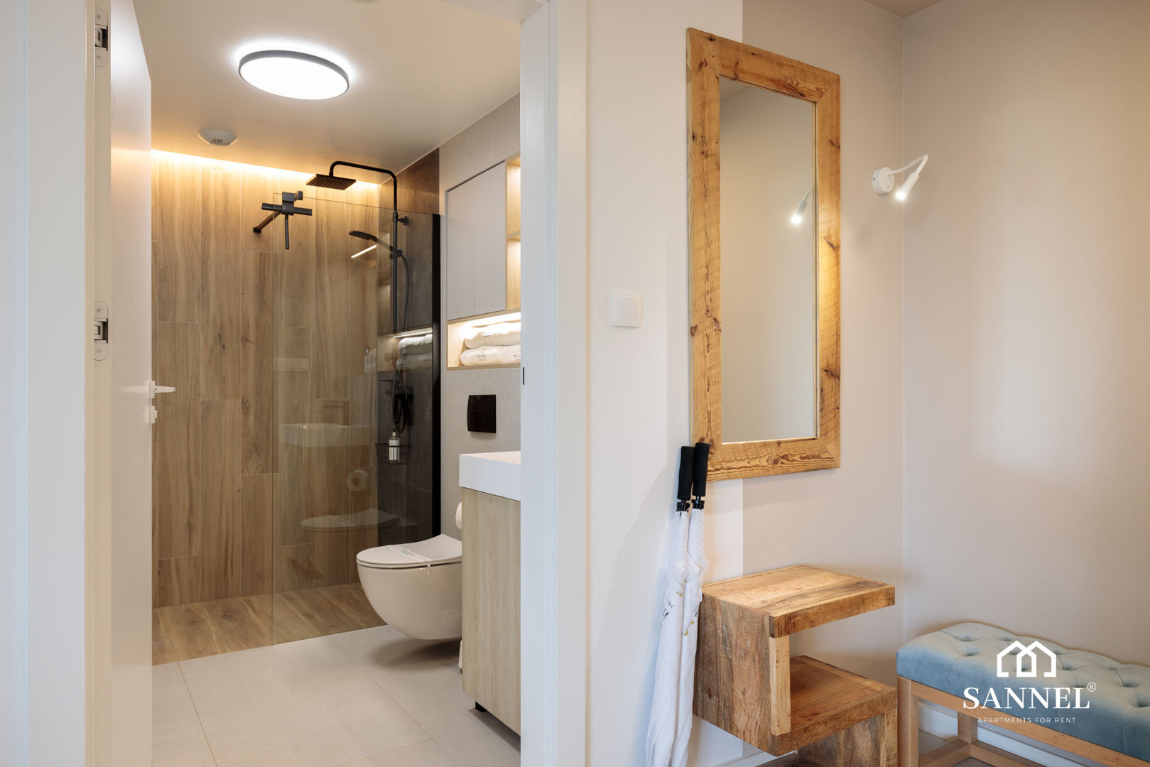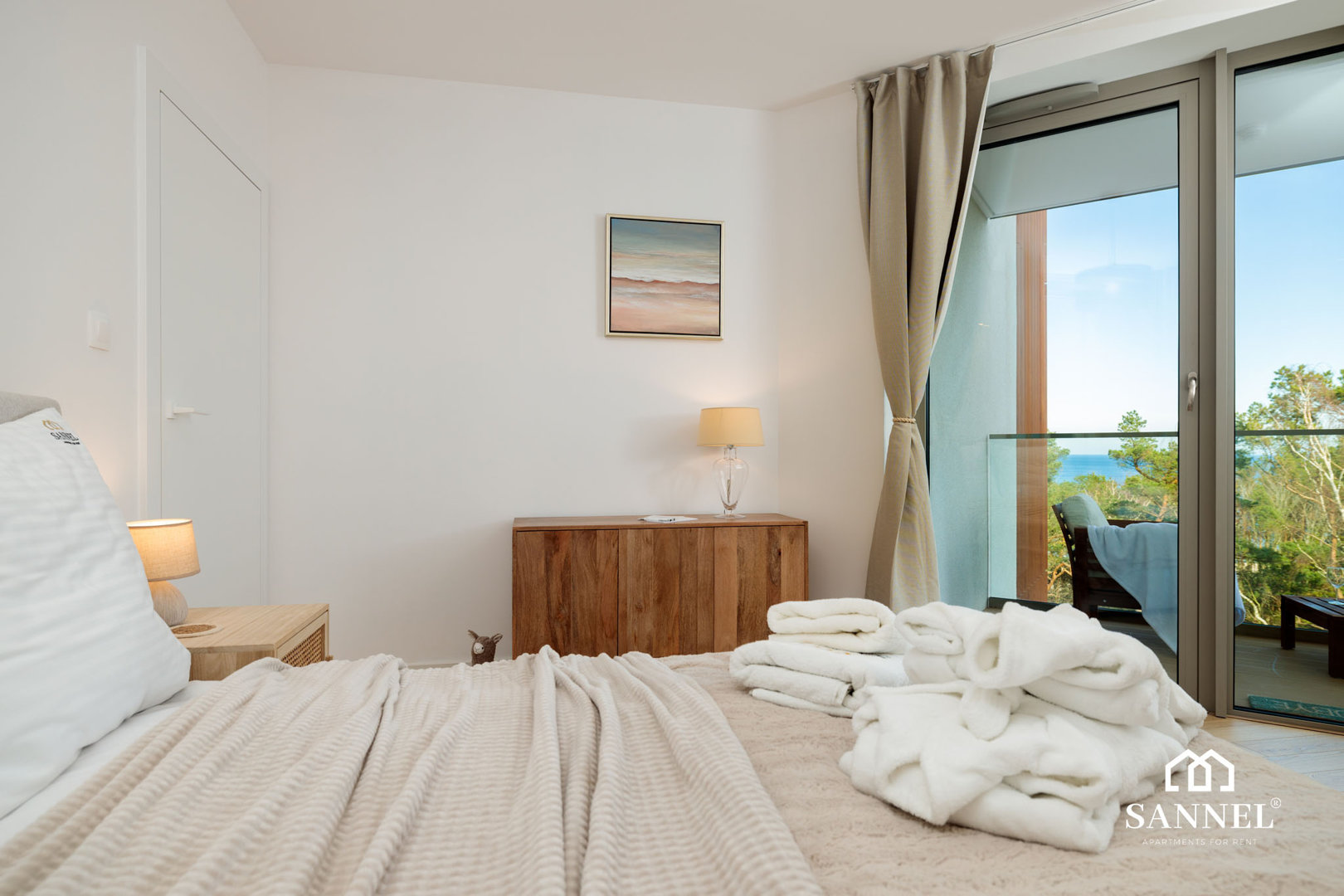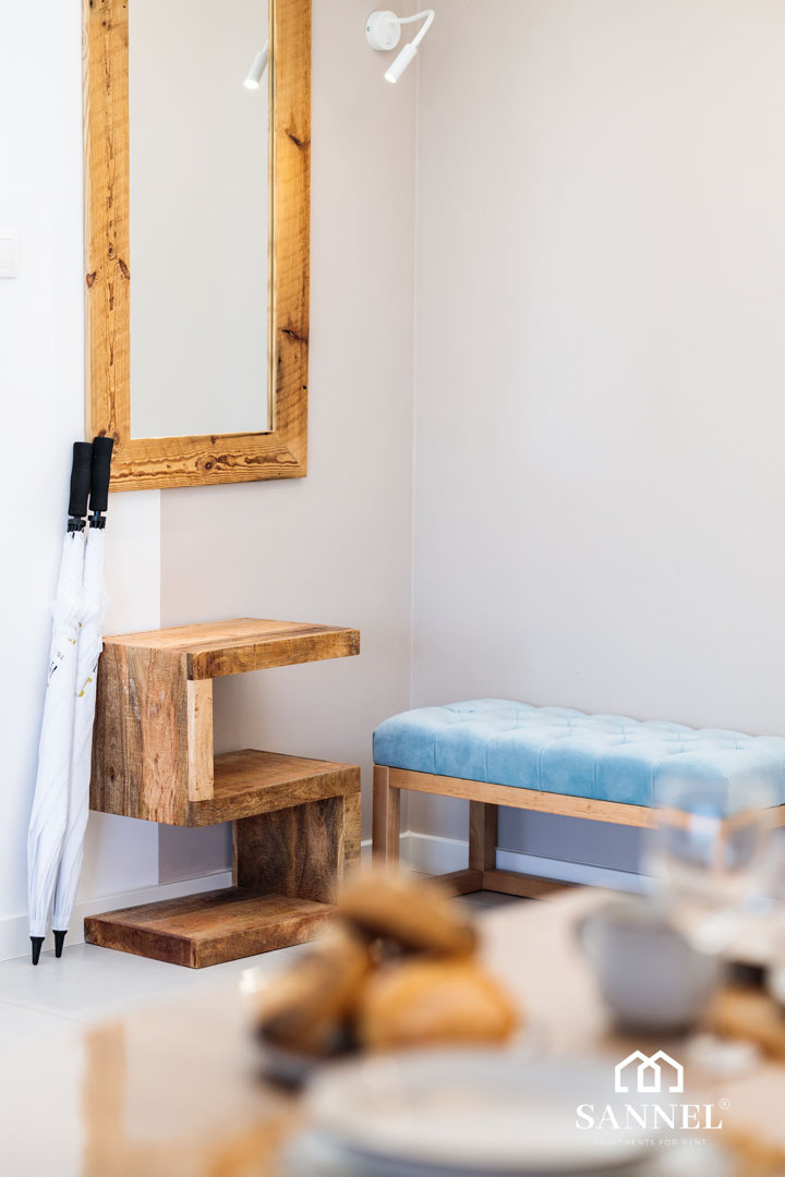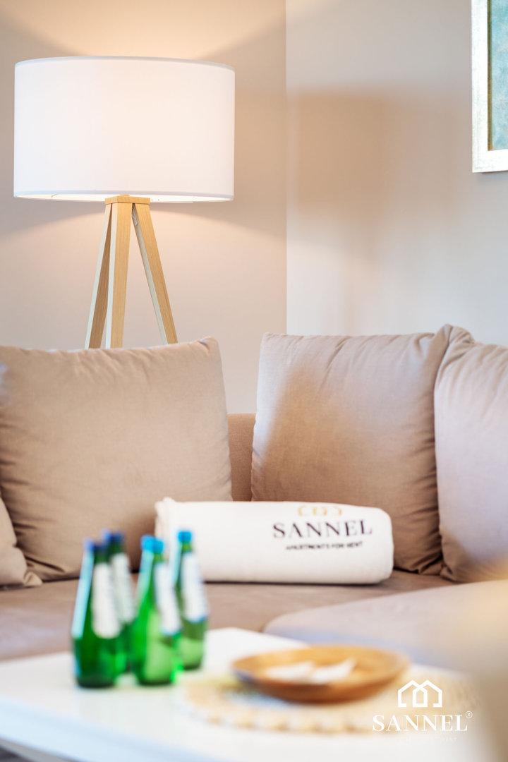 Ten unikalny a zarazem bardzo komfortowy apartament został wyposażony w najwyższej jakości sprzęty oraz umeblowanie. Apartament Lux Sea składa się z salonu z aneksem kuchennym z wydzielonym miejscem do spożywania posiłków, sypialni, garderoby,łazienki oraz dwóch balkonów z widokiem na morze. Salon wyposażony został w sofę z funkcją spania, wygodny fotel, stolik kawowy a także TV z płaskim ekranem z dostępem do kanałów w różnych językach, internetu oraz platform streamingowych. Z tego miejsca udać się można na jeden z dwóch balkonów, na którym znajduje się komplet mebli balkonowych. Aneks kuchenny apartamentu Lux Sea wyposażony został we wszystkie potrzebne sprzęty AGD takie jak toster, czajnik elektryczny, ekspres do kawy, płytę indukcyjną a także akcesoria, potrzebne do przygotowania posiłków.W aneksie umieszczona została również pralko suszarka. Przestronna i bardzo przytulna sypialnia posiada duże łóżko małżeńskie wraz z szafkami nocnymi z lampkami do czytania. Z sypialni apartamentu wyjść można na drugi balkon gdzie znajduje się komplet mebli wypoczynkowych. Z tego miejsca delektować się można pięknym widokiem na morze. Łazienka wyposażona została w przestronny prysznic z odpływem liniowym, umywalkę z blatem i szafką, podświetlane lustro oraz toaletę. W apartamencie znajduje się także oddzielna garderoba z dużą ilością miejsca do przechowywania.