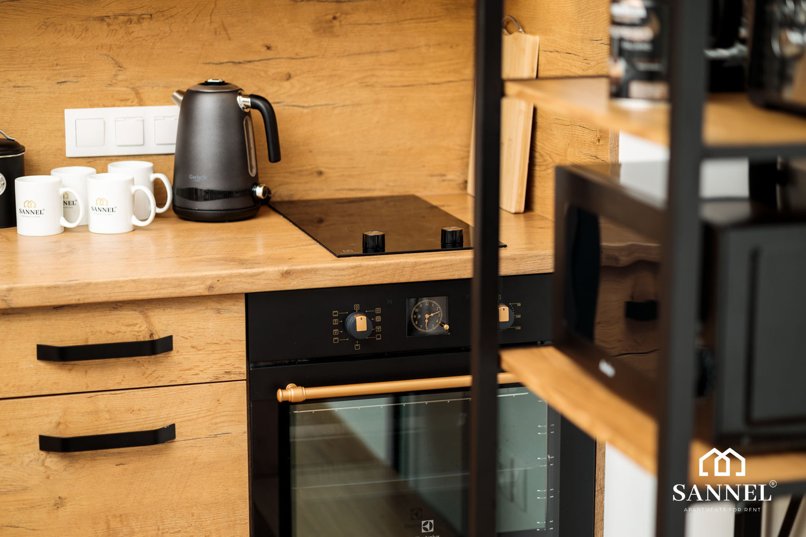 Ten nietuzinkowy a zarazem bardzo wygodny apartament został wyposażony w najwyższej jakości sprzęty oraz umeblowanie. Apartament Prestige składa się z salonu z aneksem kuchennym z wydzielonym miejscem do spożywania posiłków, sypialni, garderoby,łazienki oraz dwóch balkonów z widokiem na morze. Salon wyposażony został w sofę z funkcją spania z mechanizmem do rozkładania, szezlong, stolik kawowy, huśtawkę z której można podziwiać horyzont a także TV z płaskim ekranem z dostępem do kanałów w różnych językach, internetu oraz platform streamingowych. Z tego miejsca udać się można na jeden z dwóch balkonów, na którym znajduje się komplet mebli wypoczynkowych. Aneks kuchenny apartamentu Prestige wyposażony został we wszystkie potrzebne sprzęty AGD takie jak toster, czajnik elektryczny, ekspres do kawy, płytę indukcyjną a także piekarnik, mikrofala oraz akcesoria, potrzebne do przygotowania posiłków. Przestronna sypialnia posiada duże łóżko małżeńskie wraz z szafkami nocnymi z lampkami do czytania oraz toaletkę. Z sypialni apartamentu wyjść można na drugi balkon gdzie rozprzestrzenia się piękny widok na morze. W łazience znajduje się przestronny prysznic z odpływem liniowym, umywalka z blatem i szafką, podświetlane lustro oraz toaleta. W apartamencie znajduje się także oddzielna garderoba z dużą ilością miejsca do przechowywania.
