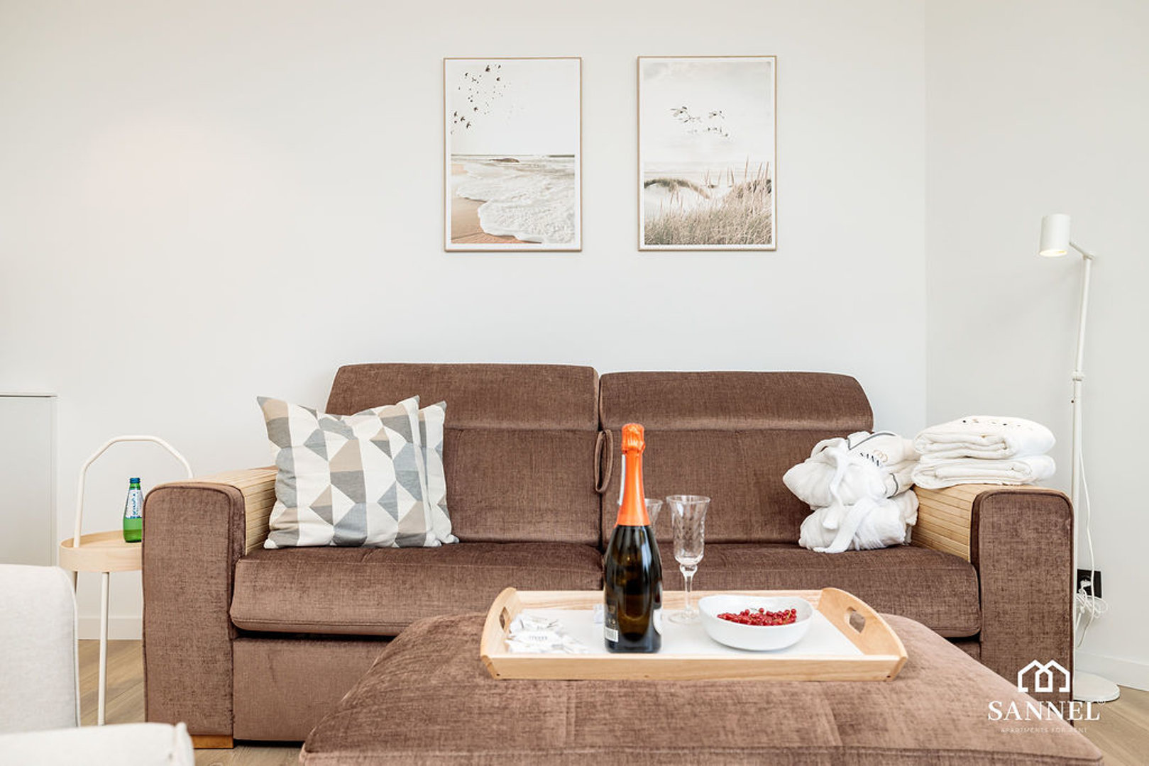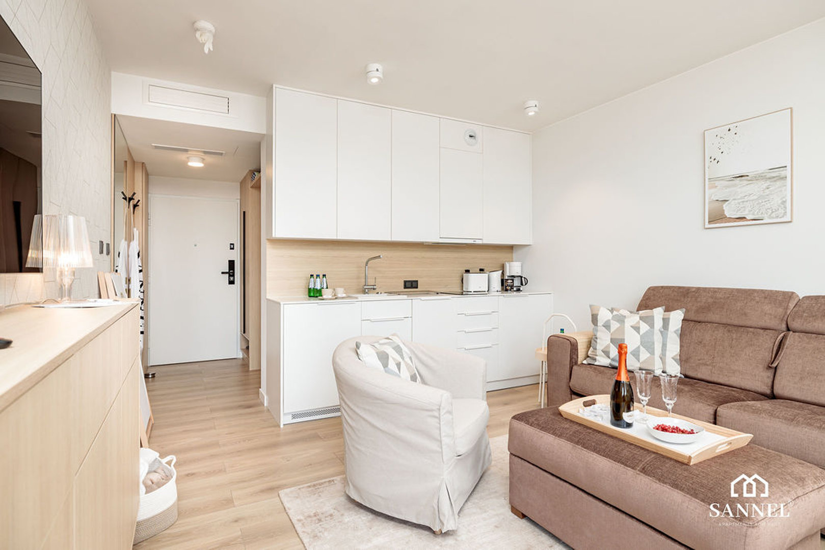 Sands składa się z salonu z aneksem kuchennym, łazienki oraz przestronnego balkonu. Pokój wyposażony został w wygodną sofę z rozkładanym stelażem do spania, pojemną komodę do przechowywania rzeczy, fotel oraz TV z dostępem do kanałów w różnych językach ( dekoder CANAL+ ), platform streamingowych oraz internetu. Wydzielone zostało także miejsce do spożywania posiłków w postaci dużego stołu z krzesłami. Na balkonie znajduje się komplet wygodnych foteli wypoczynkowych. W pełni wyposażony aneks kuchenny posiada wszystkie niezbędne akcesoria i sprzęty AGD jak toster, ekspres do kawy, czajnik elektryczny, płytę indukcyjną, potrzebne do przygotowania posiłków. W aneksie kuchennym umieszczona została także pralka. Łazienka apartamentu Sands składa się z bezprogowej kabiny prysznicowej z odpływem liniowym, umywalki z blatem i szafką, wiszącą szafkę z lustrem oraz toalety. W korytarzu znajduje się pojemna szafa do przechowywania rzeczy, duże lustro oraz wieszaki.