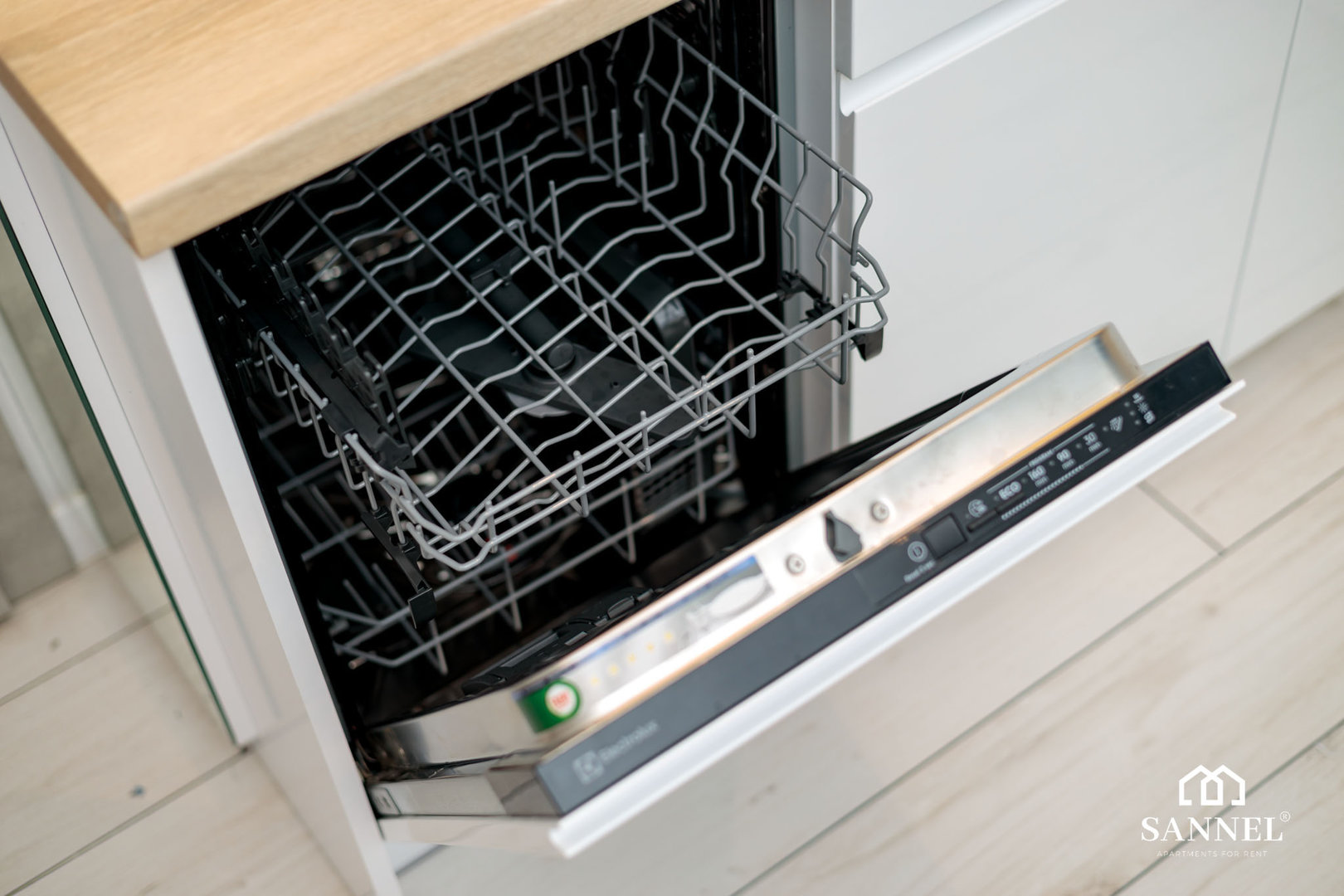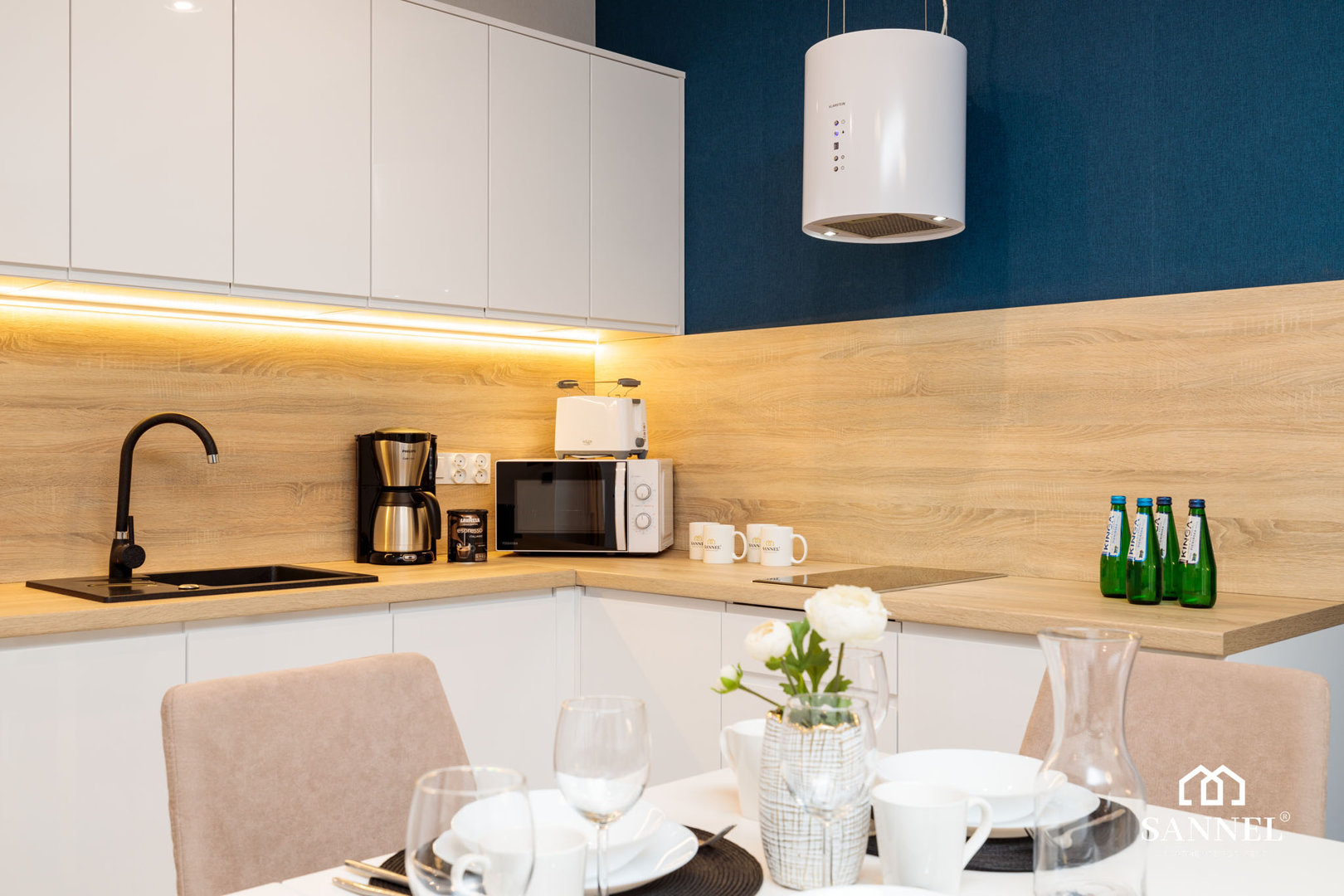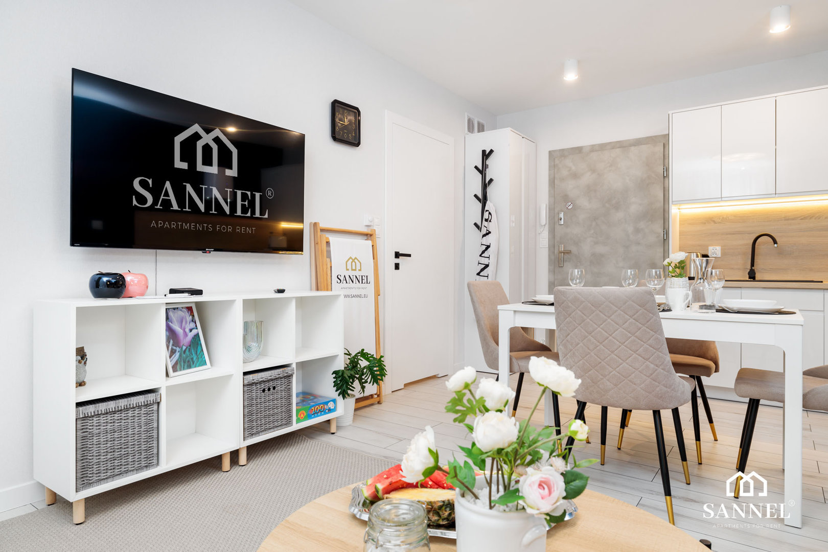 Usytuowany jest na pierwszym piętrze trzypiętrowego budynku z windą od strony wschodniej z widokiem na las. Składa się z salonu z aneksem kuchennym z wydzielonym miejscem do spożywania posiłków, sypialni, łazienki oraz przestronnego, dużego balkonu. Salon wyposażony został w sofę z funkcją spania, stolik kawowy, komodę, TV z płaskim ekranem z dostępem do kanałów kablowych, internetu oraz platform streamingowych. W tym pomieszczeniu znajduje się także stół z krzesłami do spożywania posiłków. Z salonu można wyjść na duży balkon gdzie znajduje się stół z krzesłami. Aneks kuchenny apartamentu Sunny Dune wyposażony został we wszystkie potrzebne sprzęty AGD takie jak czajnik elektryczny, ekspres do kawy, dwupalnikową płytę indukcyjną, toster, mikrofalówkę oraz wszelkie niezbędne akcesoria, potrzebne do przygotowania posiłków. Przestronna sypialnia posiada duże łóżko małżeńskie z oświetleniem do czytania, szafki oraz pojemną szafę do przechowywania ubrań. W łazience znajduje się duża kabina prysznicowa, umywalka z szafką, wiszące szafki, toaleta a także pralka.