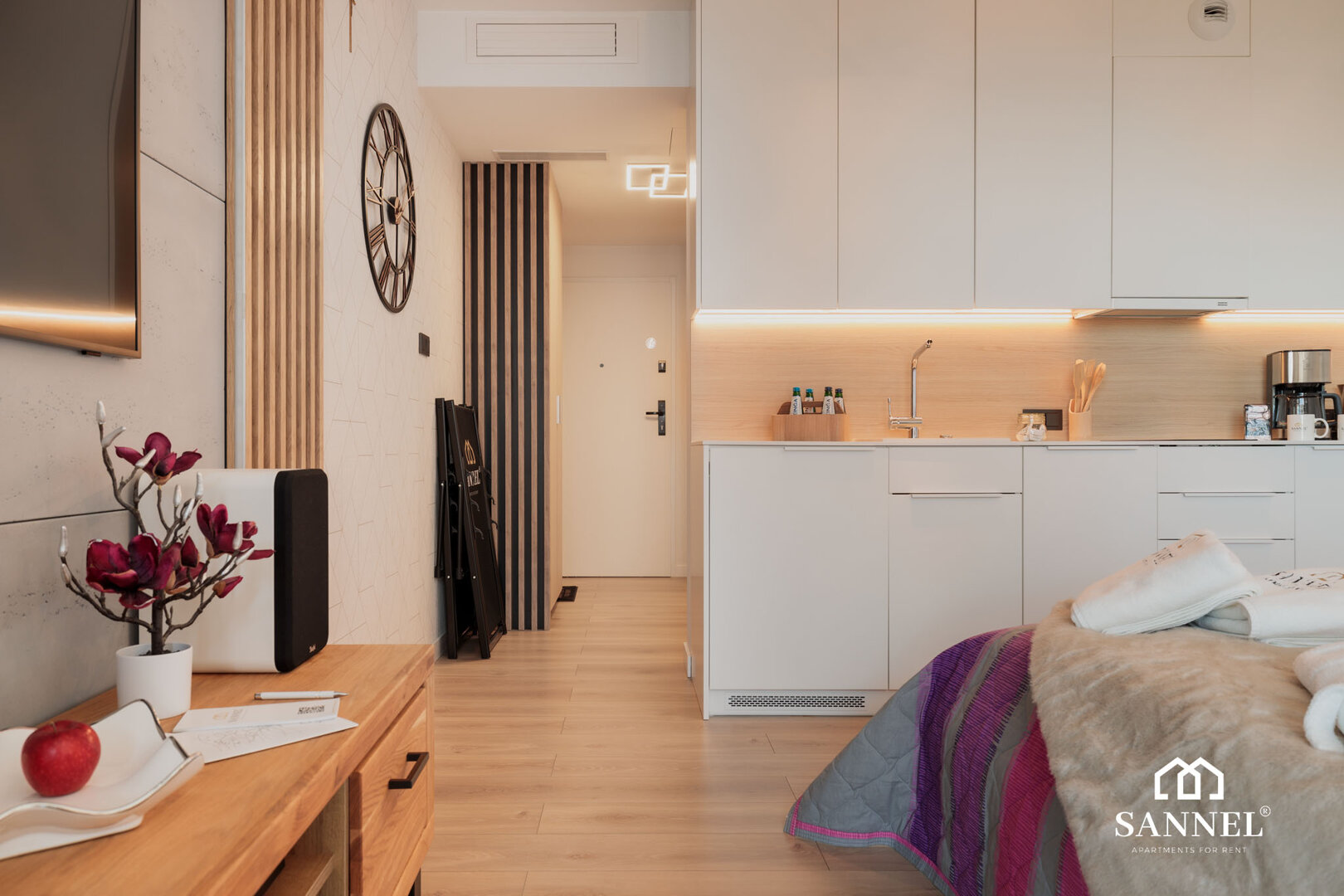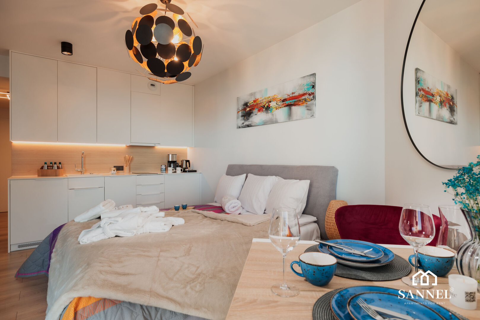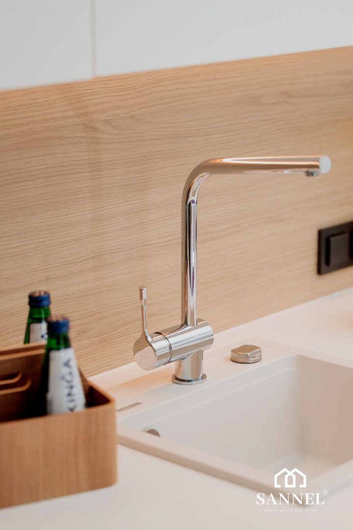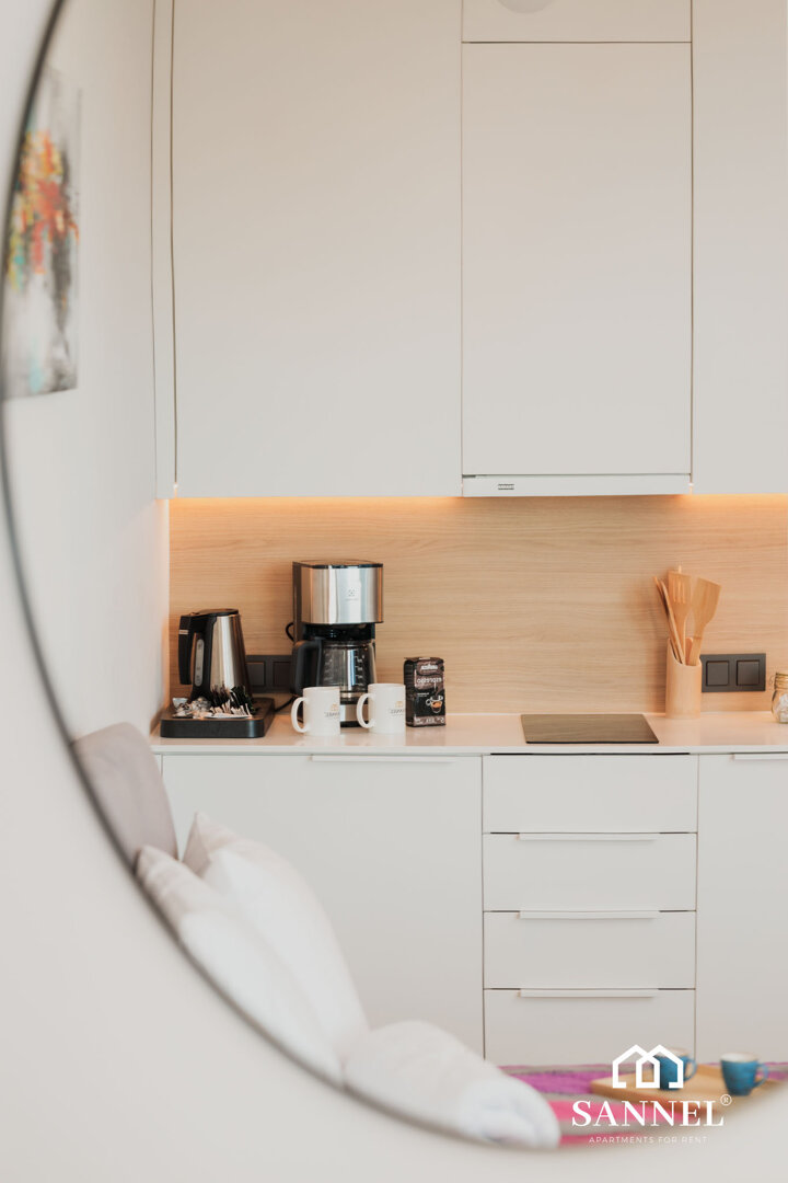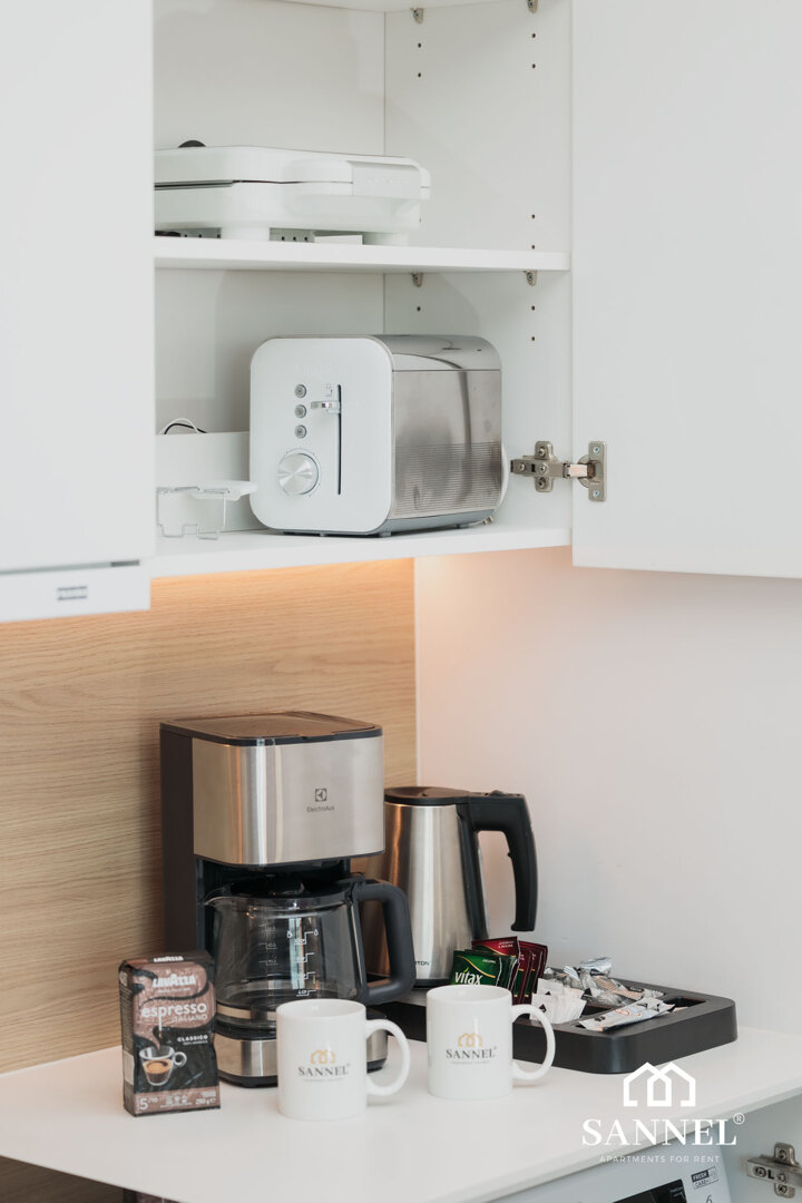 Sunset View to apartament typu studio- składający się z pokoju z aneksem kuchennym z wydzielonym miejscem do spożywania posiłków,łazienki oraz klimatycznego balkonu gdzie można delektować się widokiem morza,szumem fal i poczuć nadmorską bryzę. Apartament Sunset View posiada duże i wygodne łóżko sypialniane,gustowne meble do przechowywyania a także TV z płaskim ekranem z dostępem do kanałów w różnych językach, internetu oraz platform streamingowych. Aneks kuchenny Sunset View wyposażony został w potrzebne sprzęty AGD takie jak toster, czajnik elektryczny, ekspres do kawy, płytę indukcyjną a także akcesoria, potrzebne do przygotowania posiłków.W aneksie umieszczona została również pralka. Łazienka posiada przestronny prysznic z odpływem liniowym, umywalkę z blatem i szafką oraz toaletę.Na klimatycznym balkonie znajduje się komfortowy komplet mebli wypoczynkowych. Z tego miejsca delektować się można przepięknym widokiem na morze i zapierające dech zachody słońca.